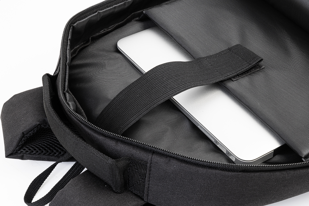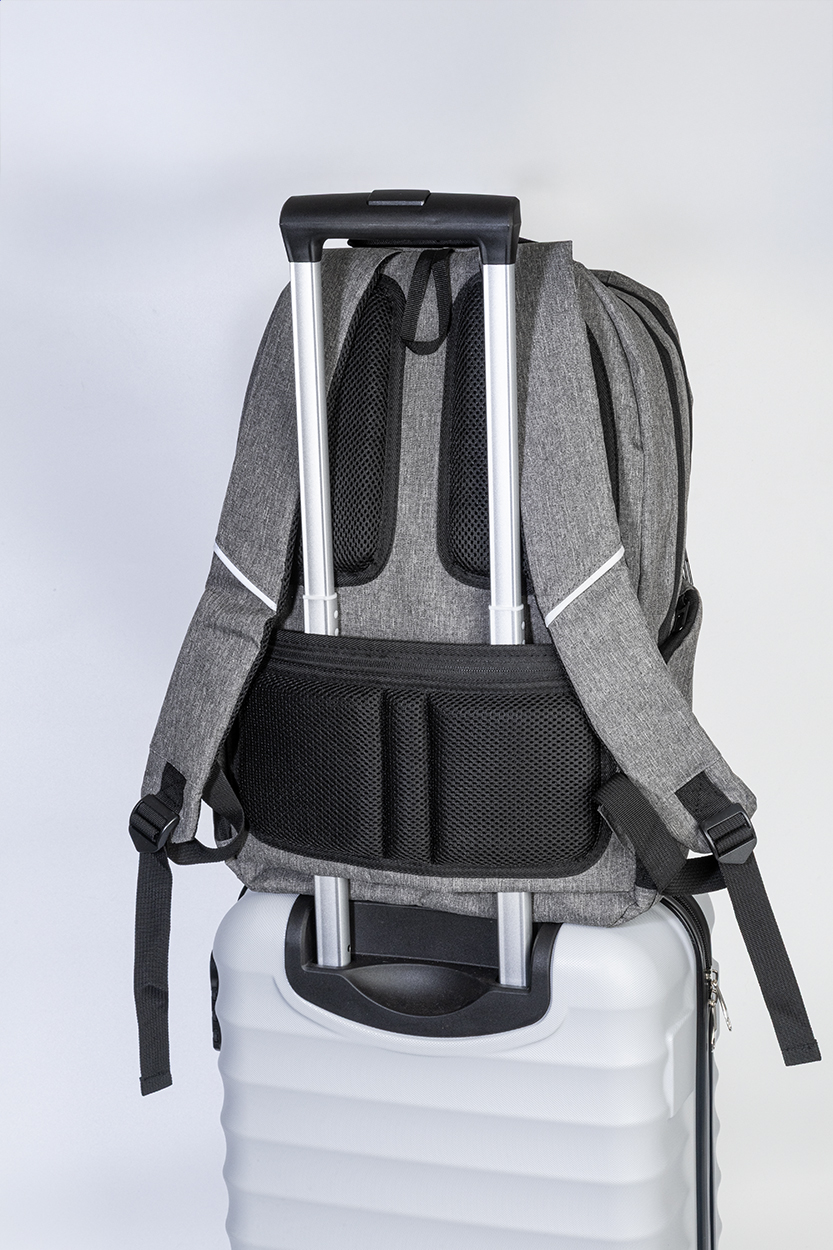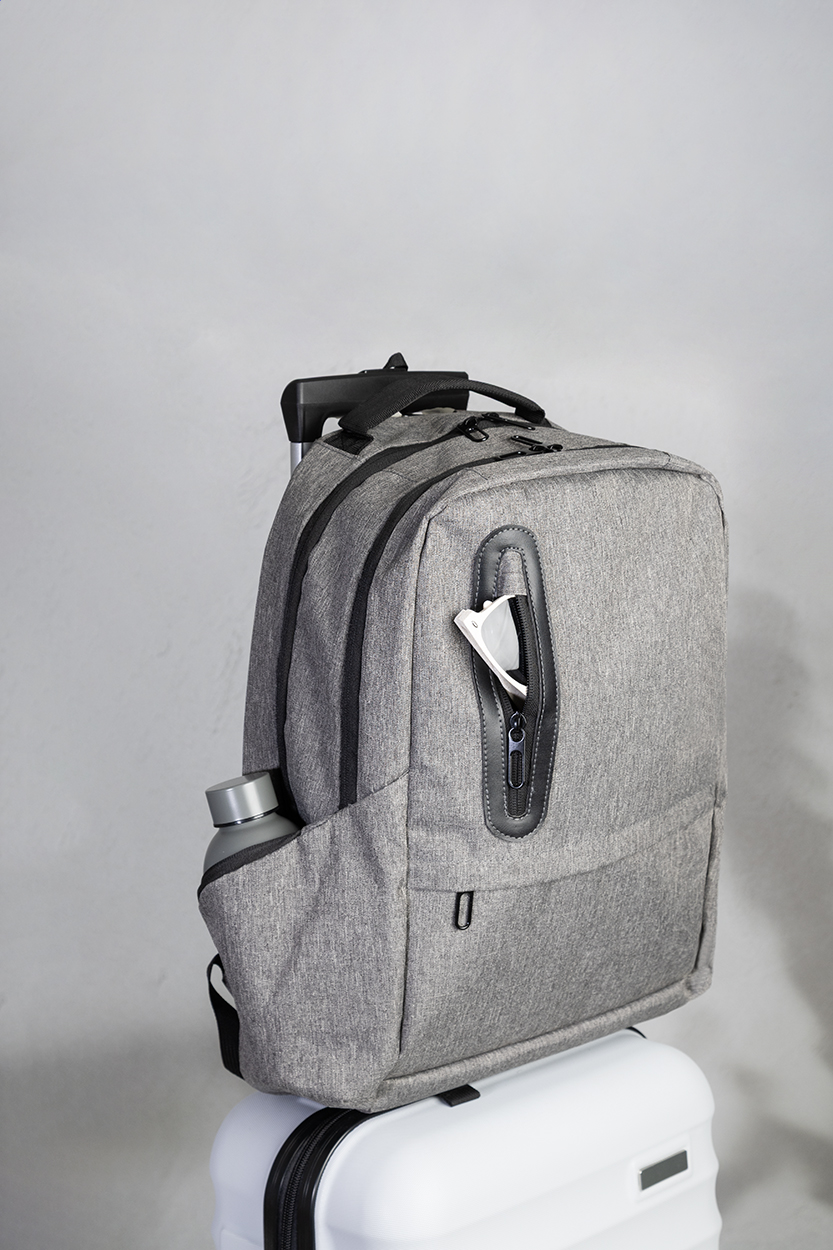 RPET backpack with zipped compartments, 2 zipped front pockets, zipped side pockets and padded laptop (15") compartment. With padded back and shoulder straps, anti-theft pocket and trolley strap. With 300D RPET polyester, with distinctive RPET label.