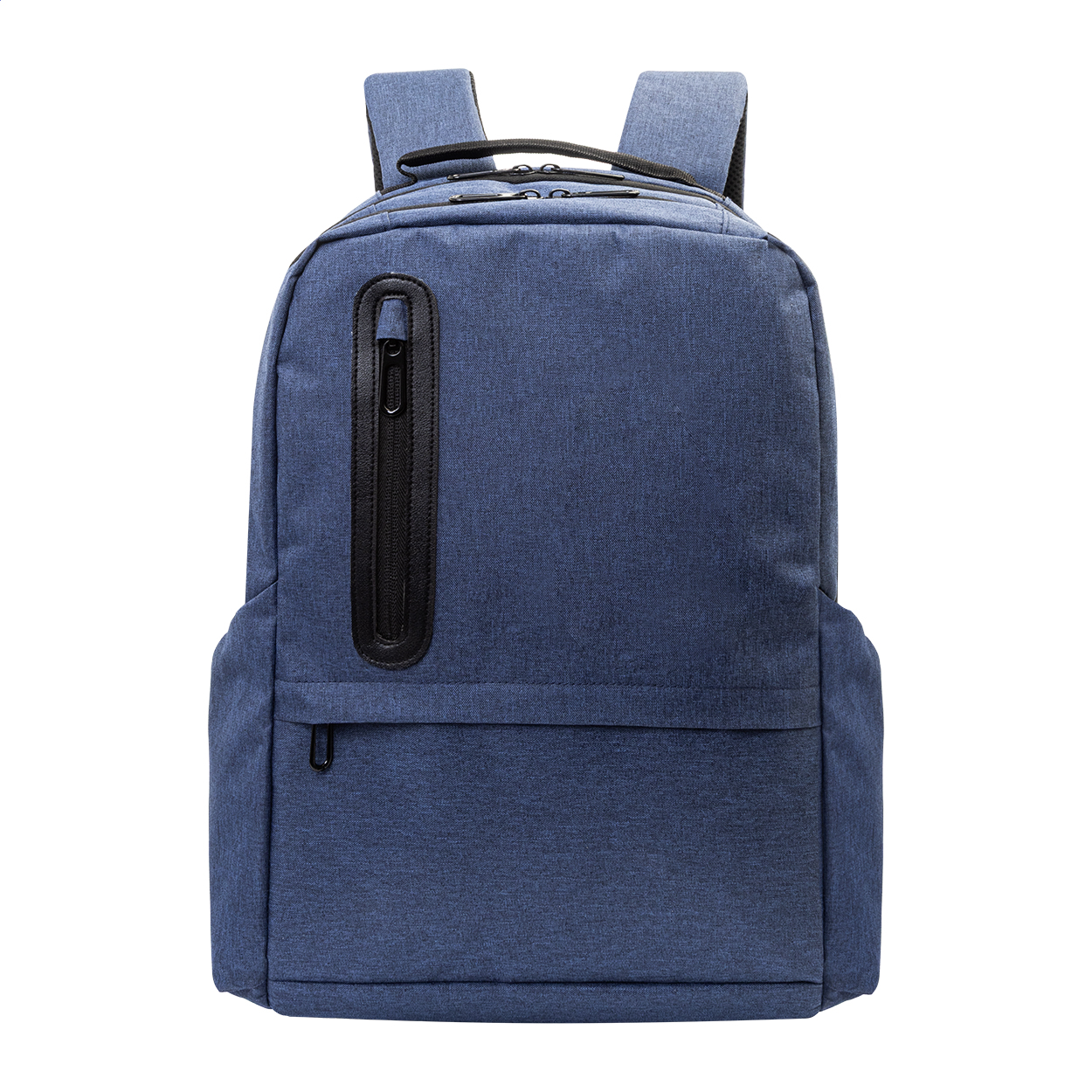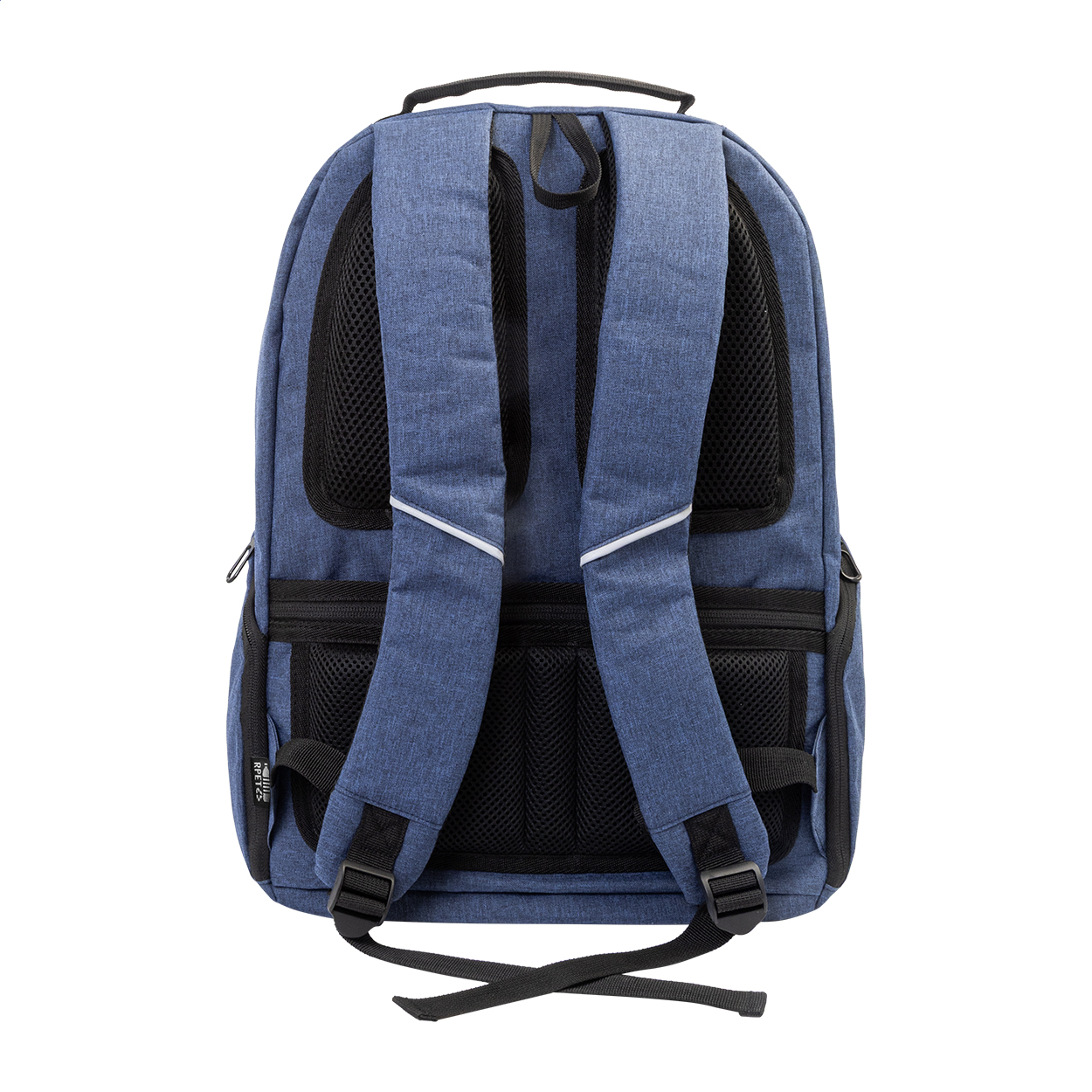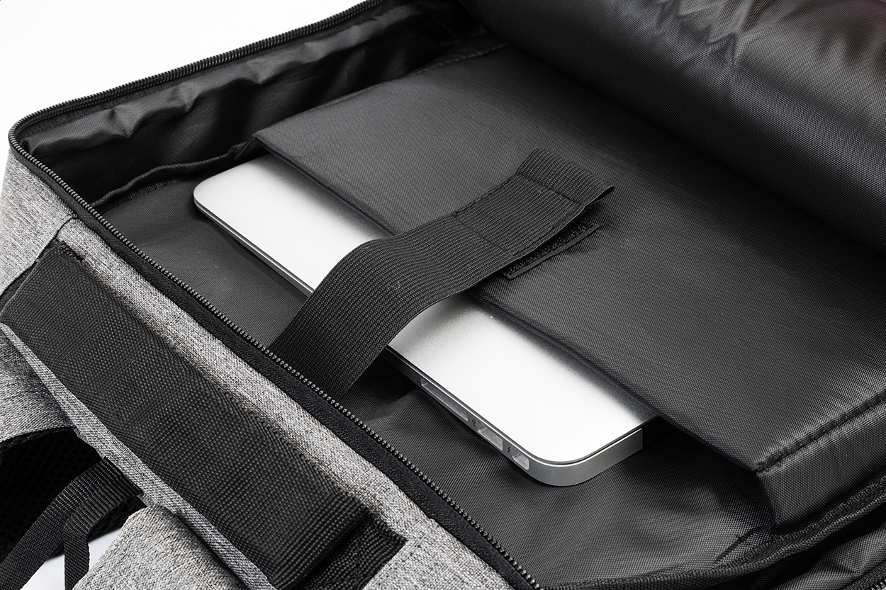 RPET backpack with zipped compartments, 2 zipped front pockets, zipped side pockets and padded laptop (15") compartment. With padded back and shoulder straps, anti-theft pocket and trolley strap. With 300D RPET polyester, with distinctive RPET label.