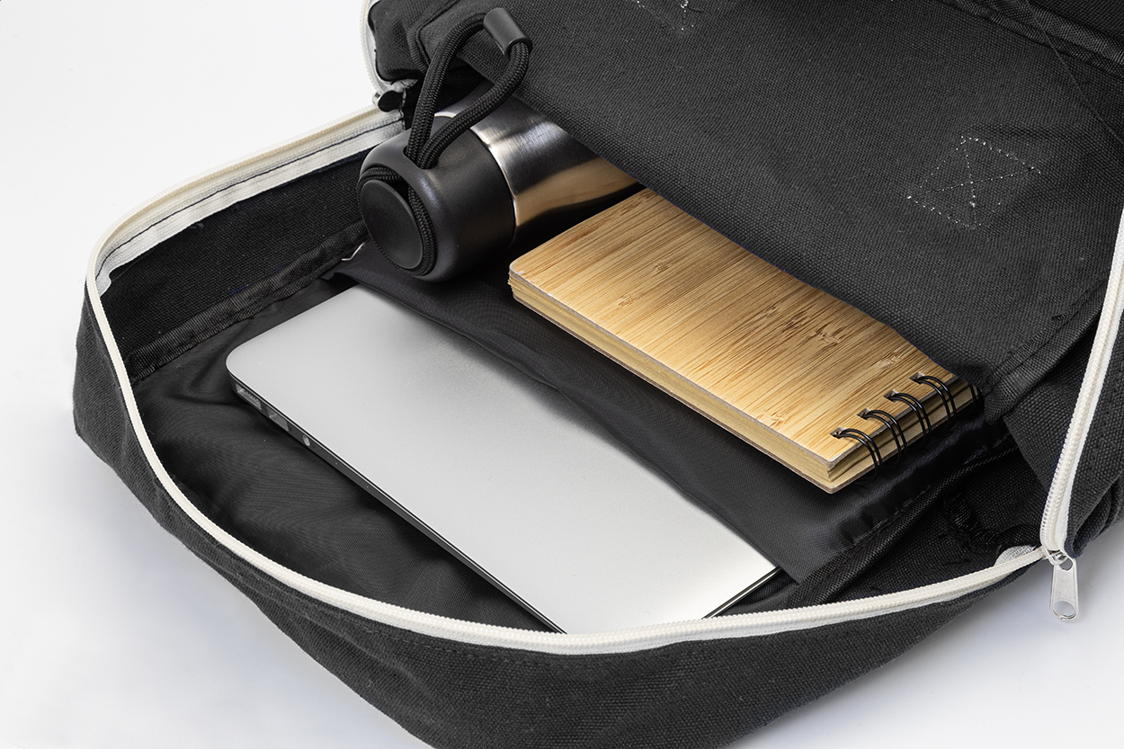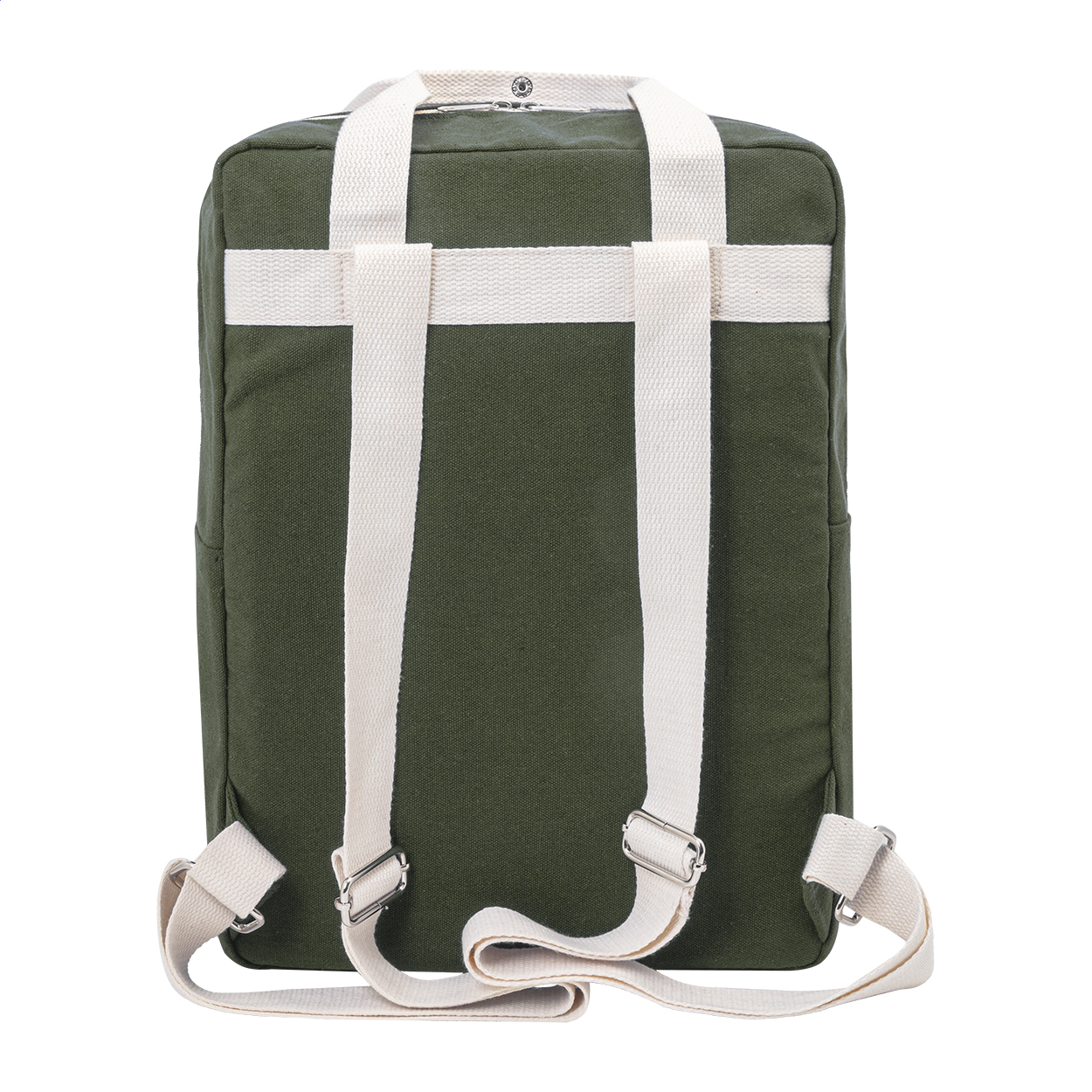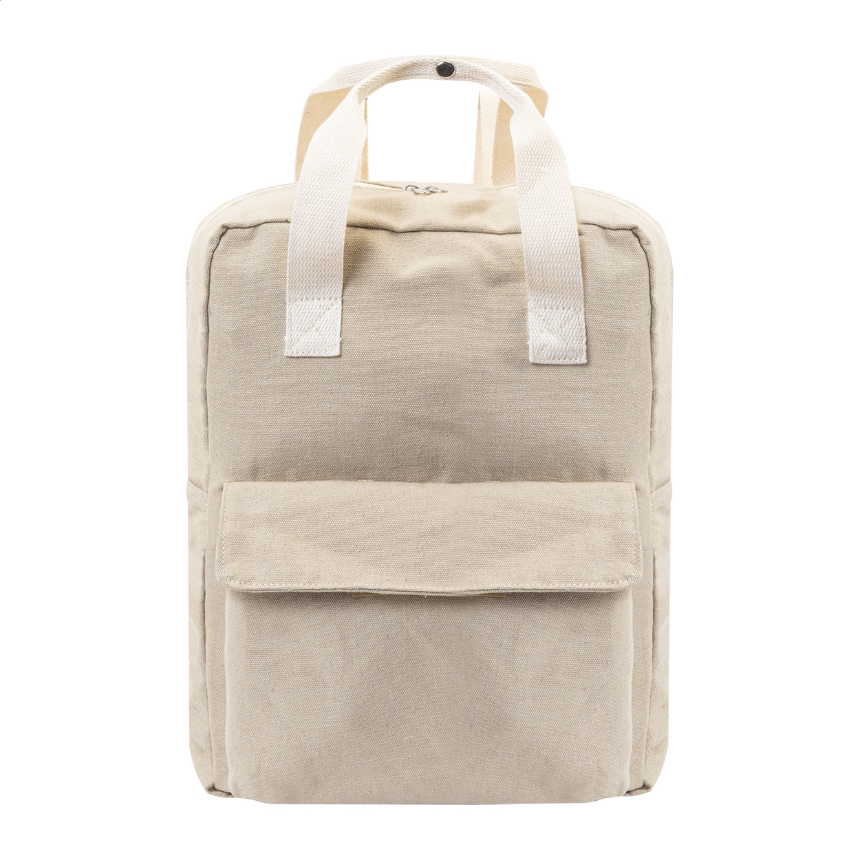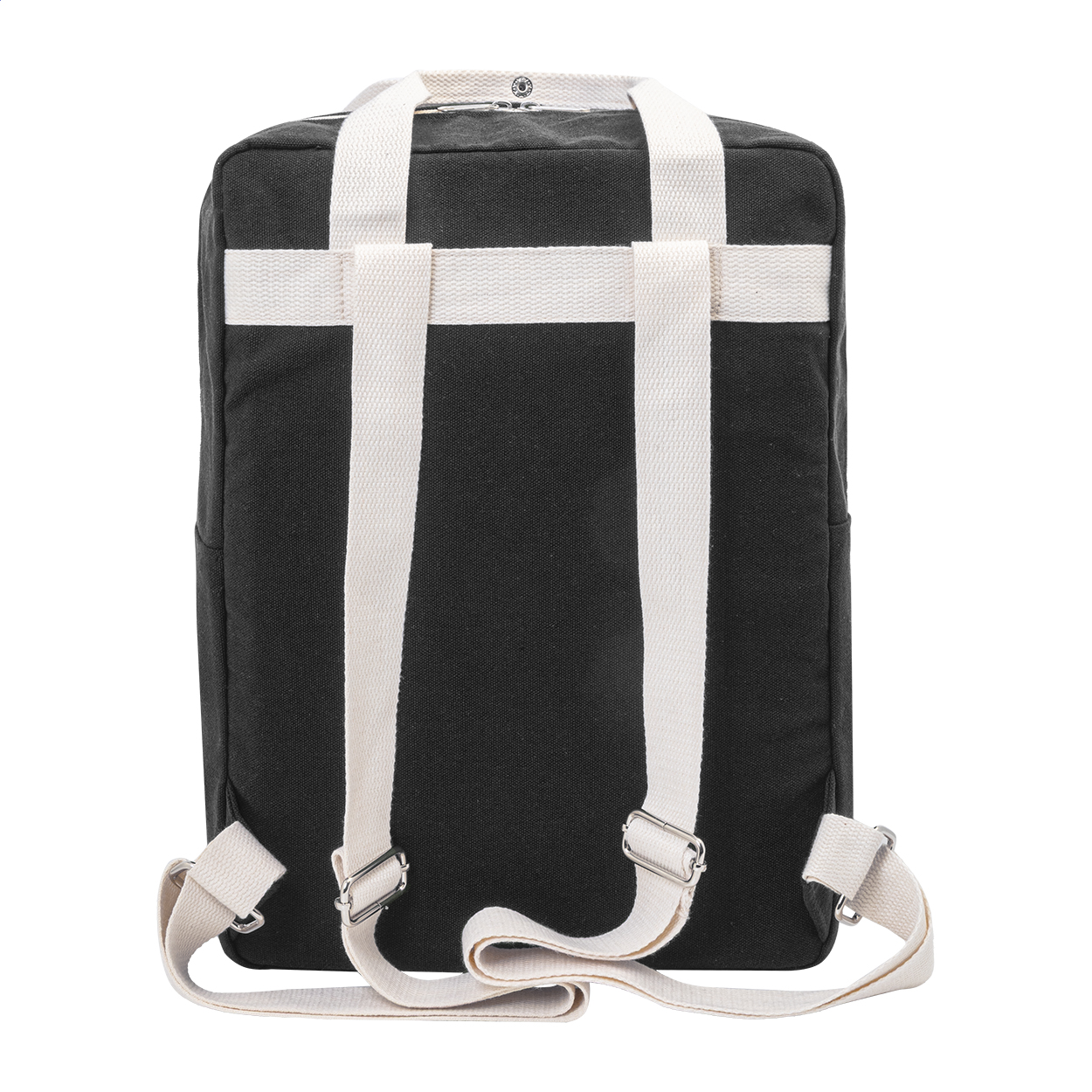 Recycled canvas backpack with zipped main compartment, padded laptop (13") compartment and velcro closure front pocket. 70% recycled cotton and 30% RPET polyester. With distinctive recycled cotton label.
