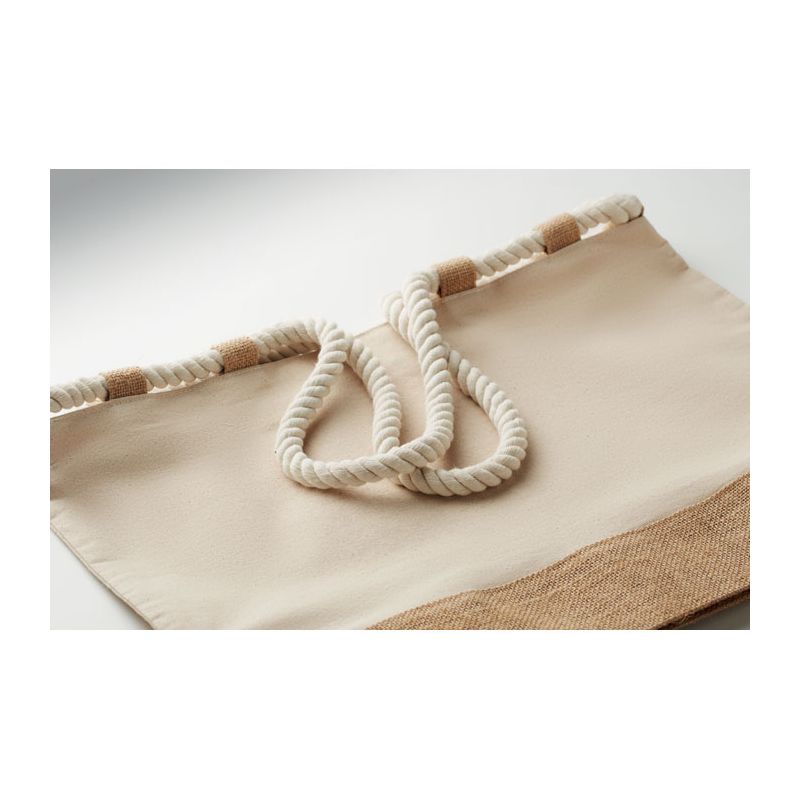 Torba za plažu od pamučnog platna 280 g/m² i jute s ručkama od užeta. Ima zatvaranje patentnim zatvaračem, dno presvučeno jutom i 10 jutenih omči.