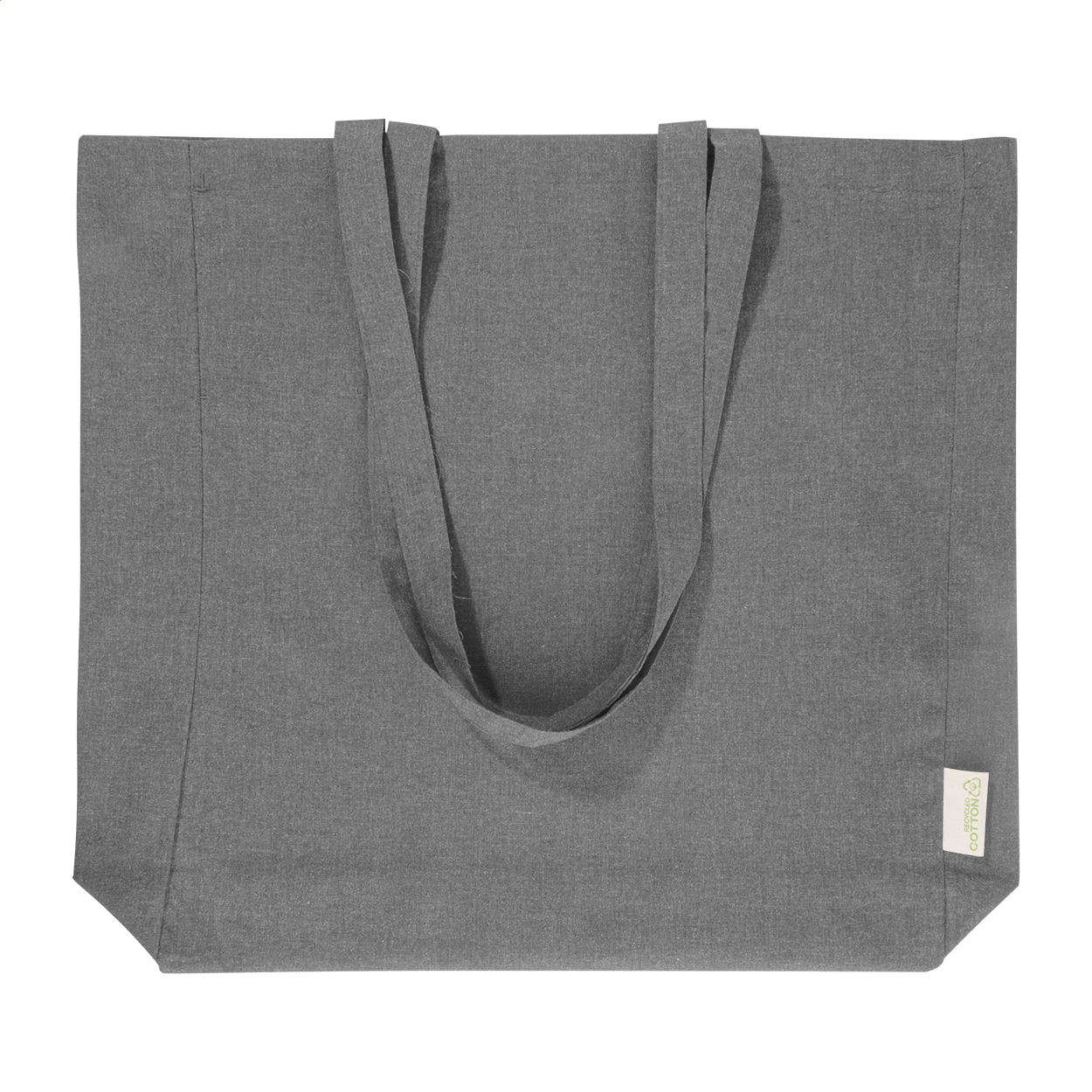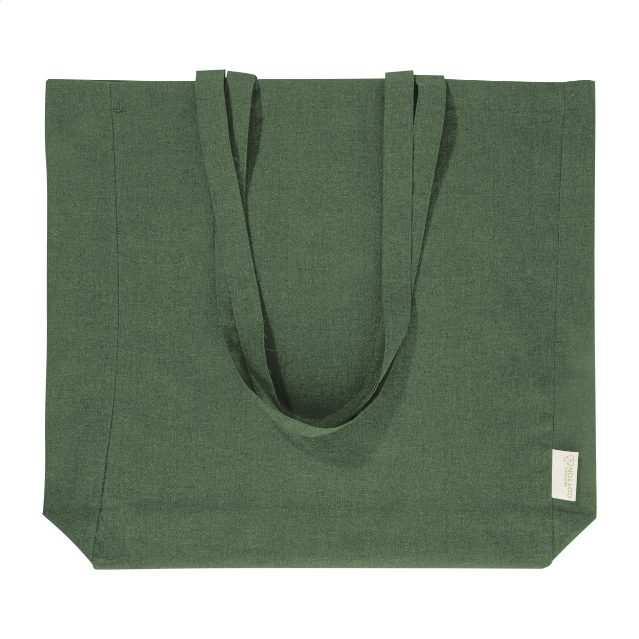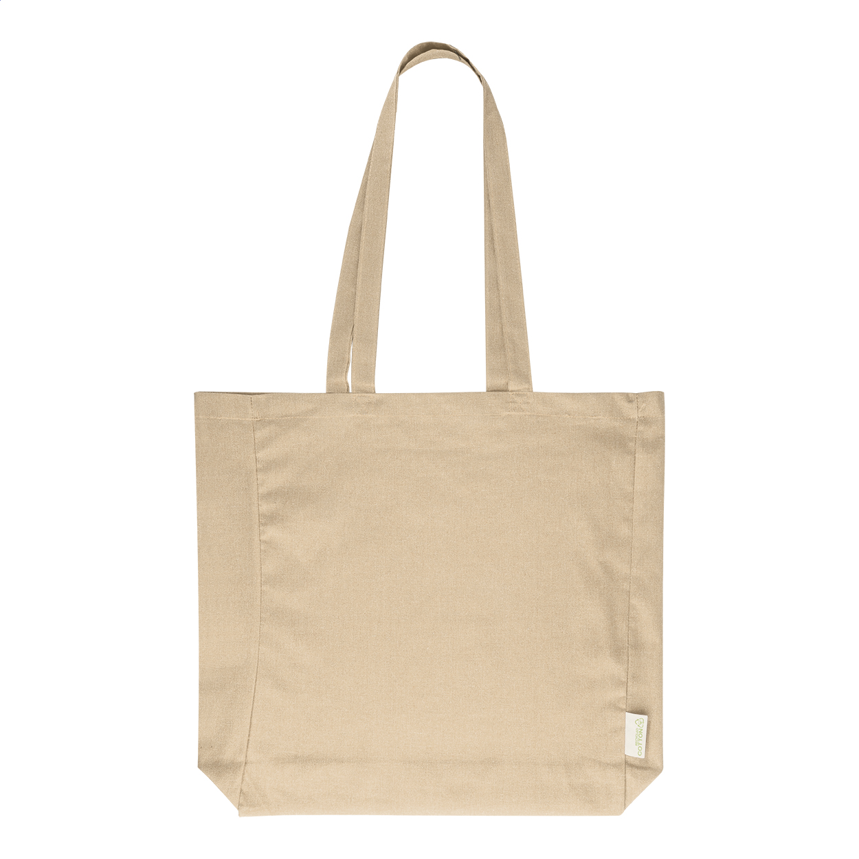 Shopping bag with gusset and long handles in 70% recycled cotton and 30% RPET polyester, 140 g/m². With distinctive recycled cotton label.