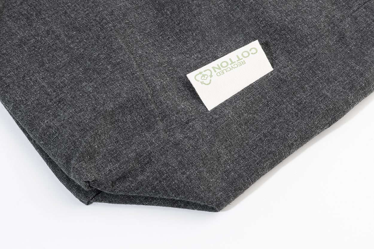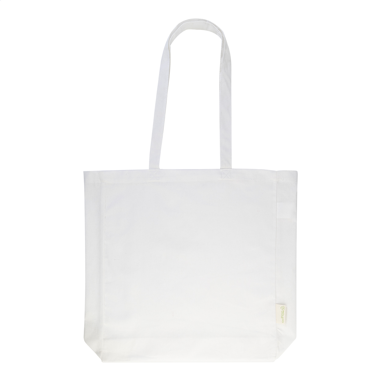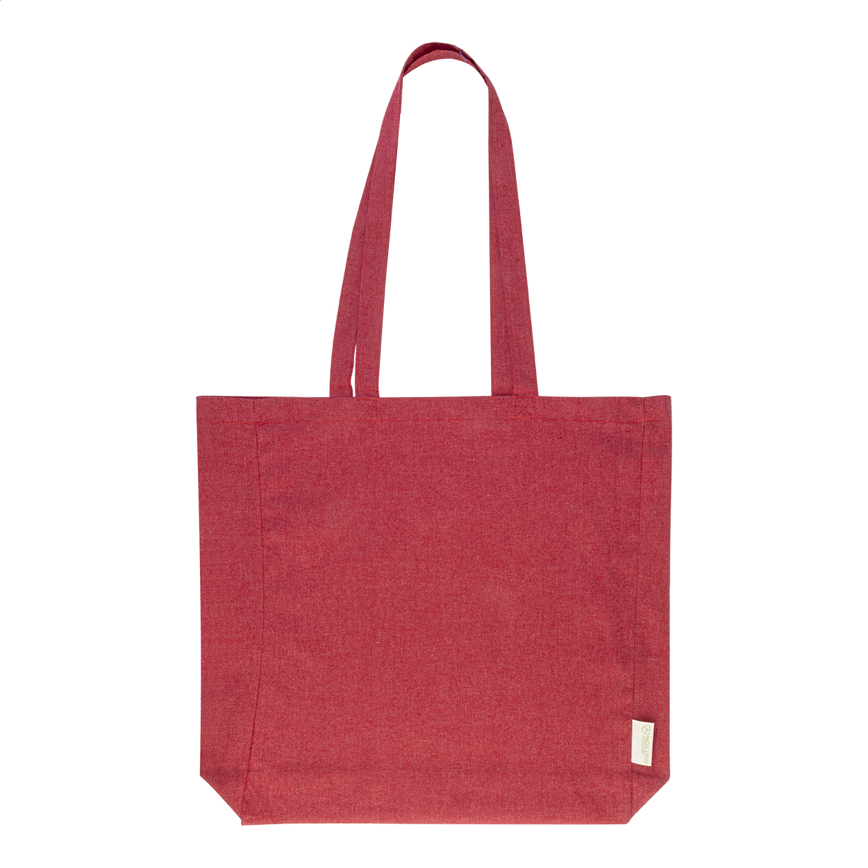 Shopping bag with gusset and long handles in 70% recycled cotton and 30% RPET polyester, 140 g/m². With distinctive recycled cotton label.