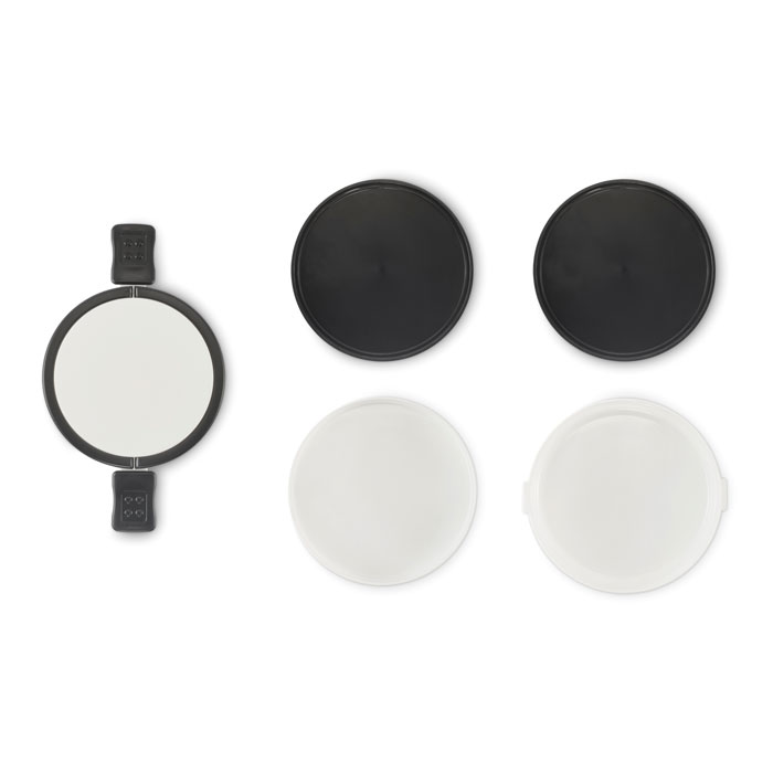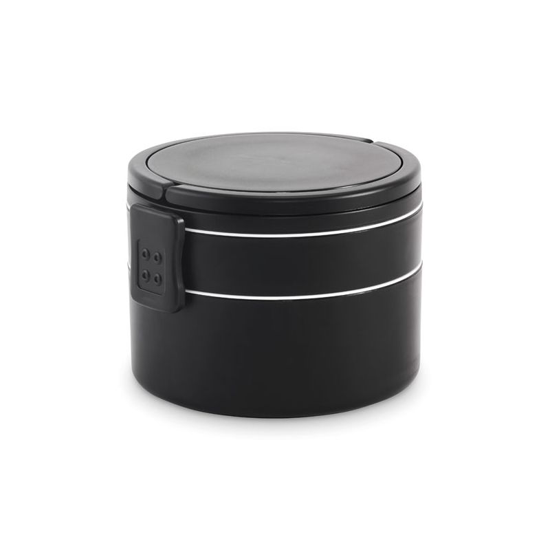 Dvoslojna okrugla kutija za ručak od PP materijala s bočnim kopčama i ručkama. Uključuje unutarnje bijele poklopce. Zapremina: gornji dio 250 ml, donji dio 700 ml.