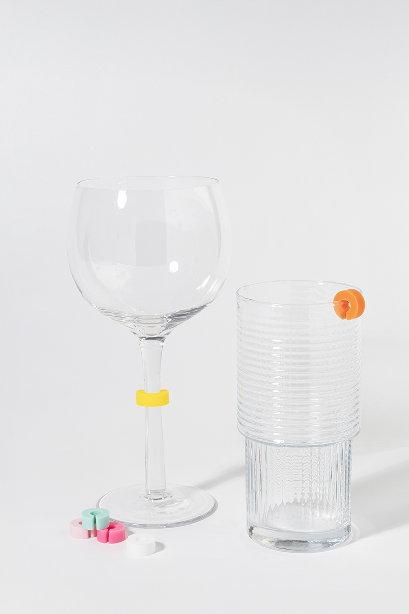 Colourful 12 pc silicone glass marker bead set in a recycled PP storage box.