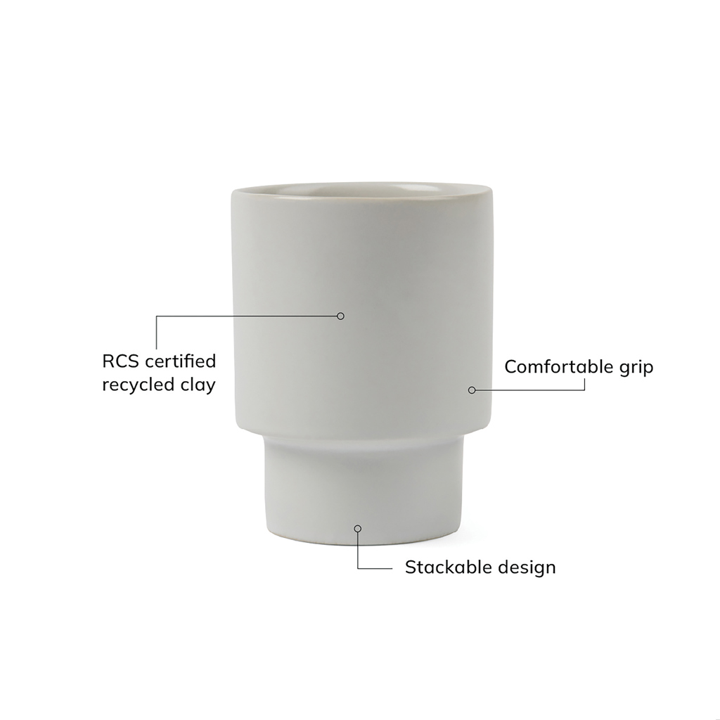 Elevate your coffee or tea with the Nagano pure mug, thoughtfully crafted from partly recycled clay. This mug blends simplicity with a modern twist, embodying the essence of Scandinavian design. Its stackable design ensures efficient use of space, making it a practical addition to any kitchen. With a comfortable grip that fits perfectly in the hand. RCS (Recycled Claim Standard), RCS certification guarantees that the entire supply chain of recycled materials is certified. The total recycled content is based on the overall product weight. The total recycled content is based on the overall product weight. This product contains 10% RCS certified recycled clay.