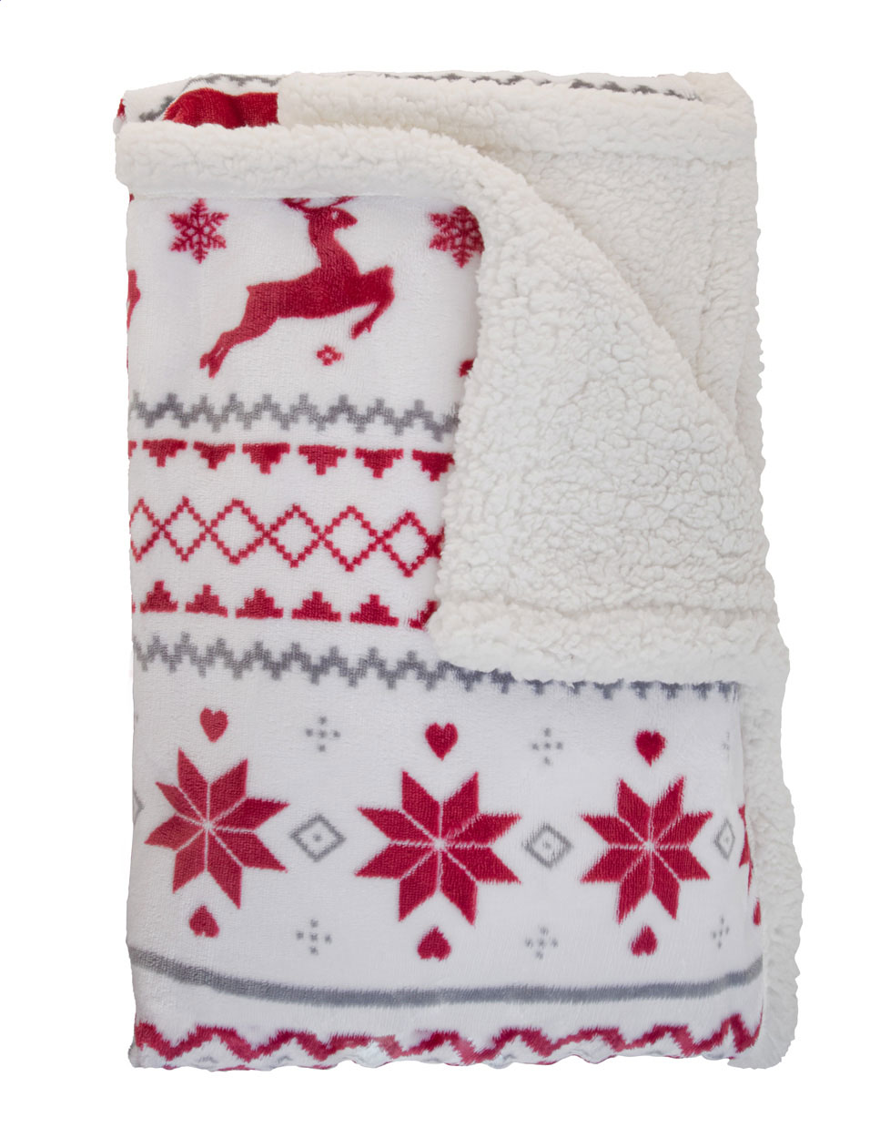Dual-layer RPET Christmas blanket with 230 g/m² RPET flannel fleece and reversible 210 g/m² RPET sherpa fleece lining. Wrapped in ribbon and printable paper card.