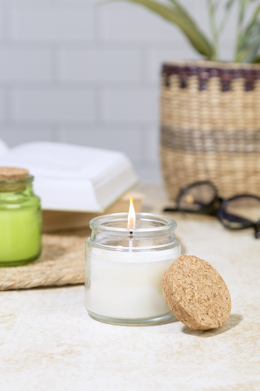 Vanilla scented plant-based wax candle in glass holder with natural cork lid. With 80 grams of wax. Burn time: 16 hours. In kraft paper box.