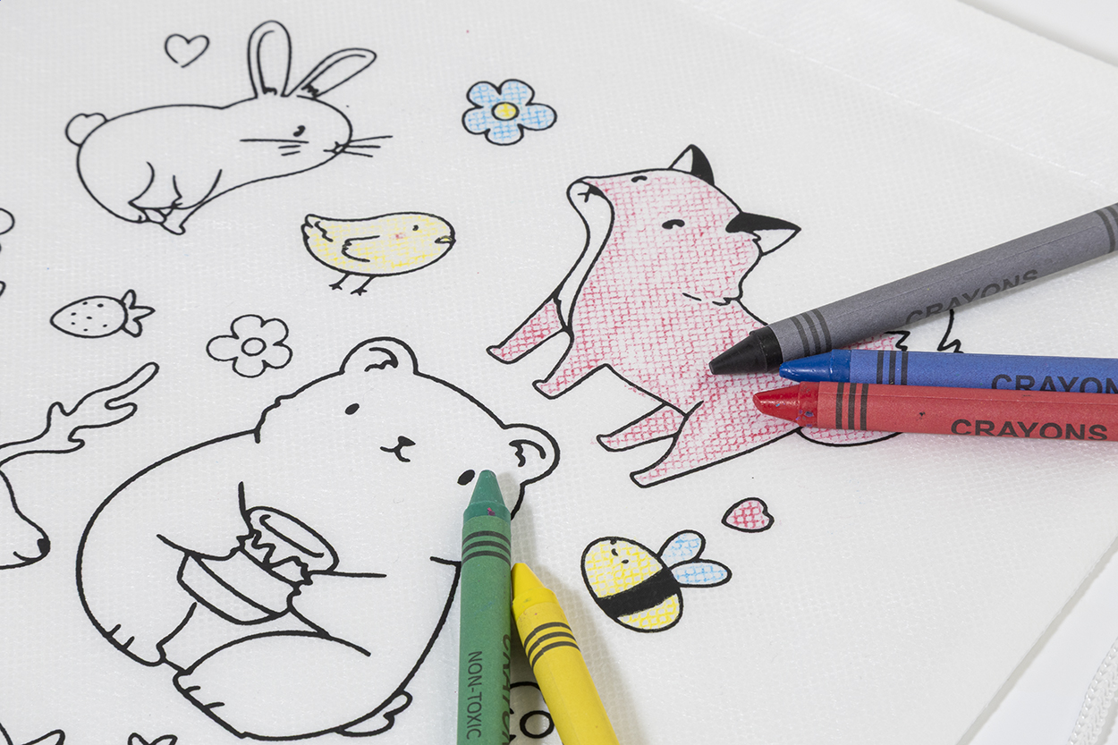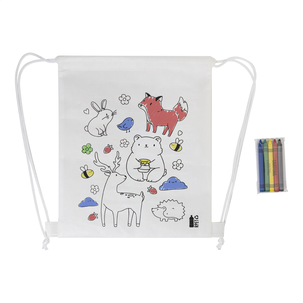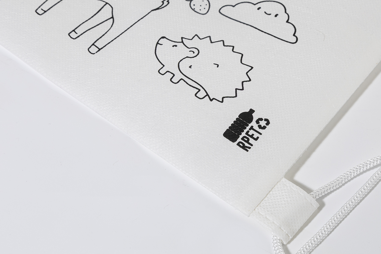 Colouring drawstring bag for children in RPET non-woven with 5 crayons.