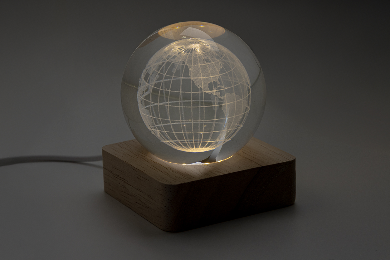 Glass globe ball with wooden LED light base. Including USB charger cable.