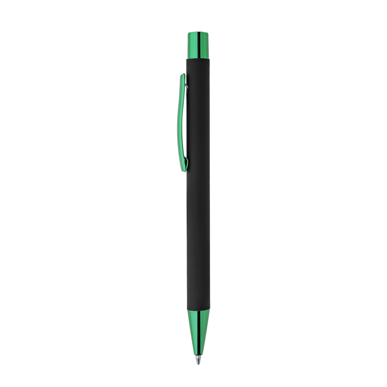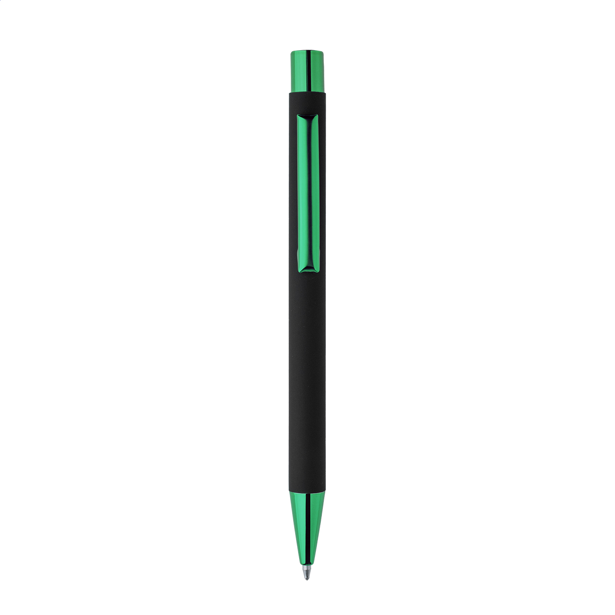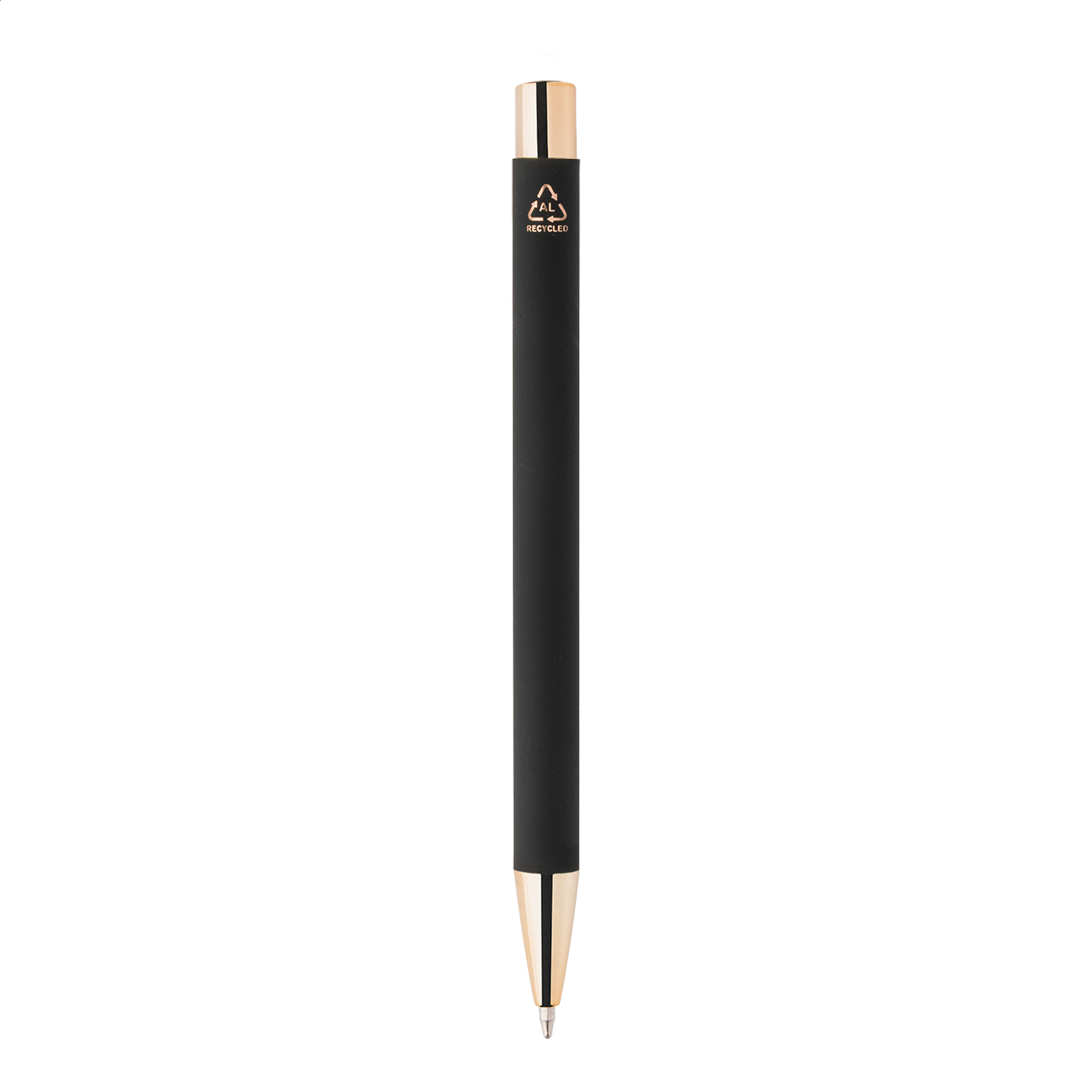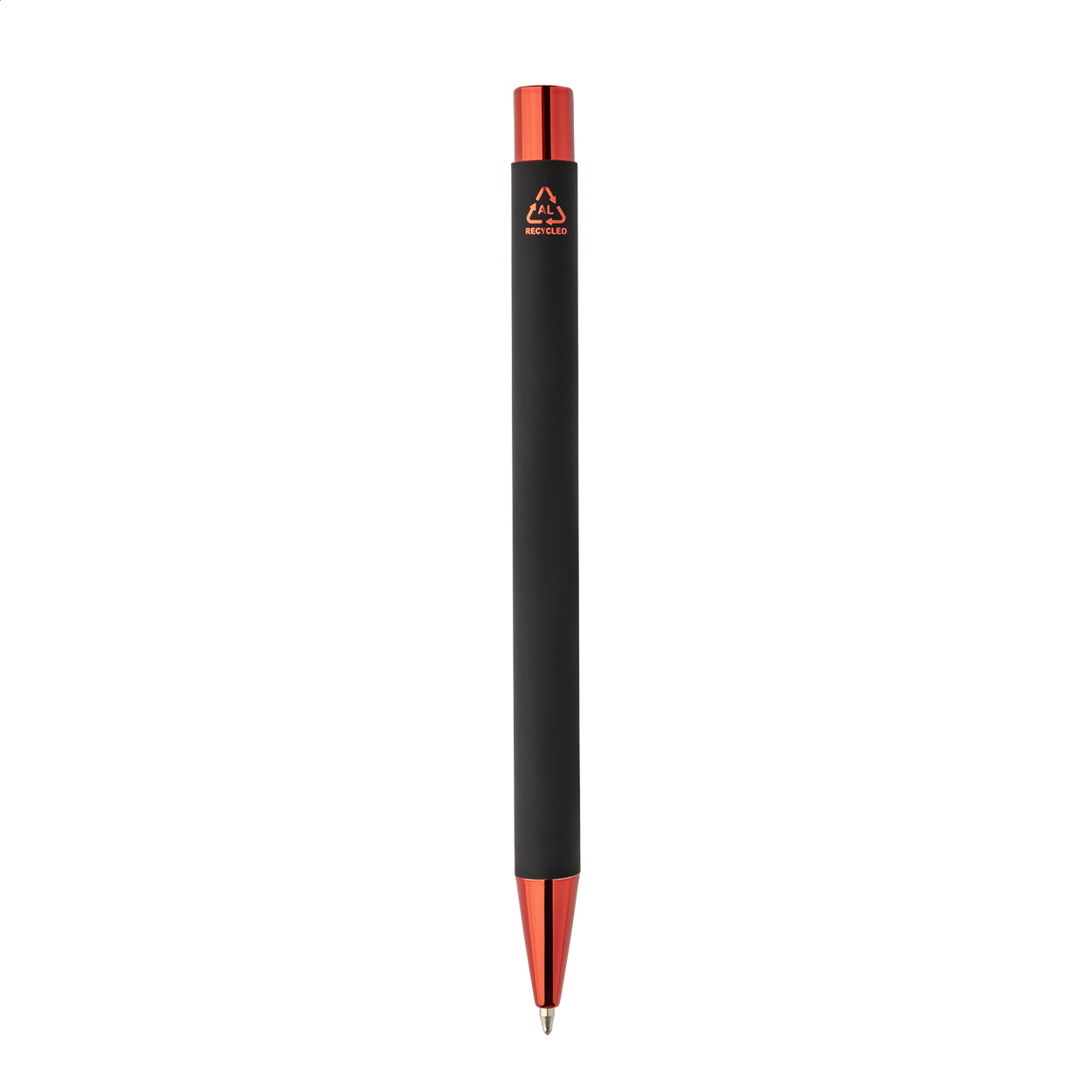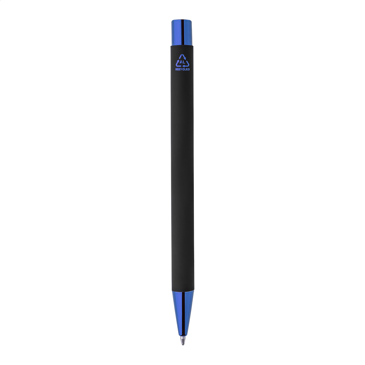 Recycled aluminium ballpoint pen with black rubberized body and coloured shiny metallic finish parts. With special coating for mirror engraving matching the metallic parts. With blue refill.