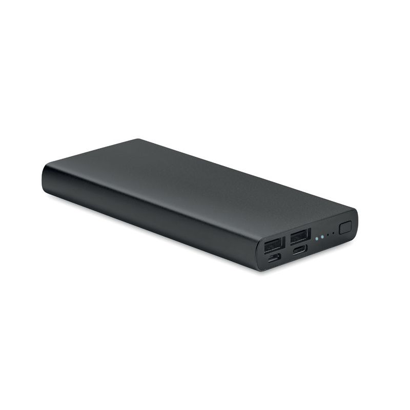 Power bank 10000 mAh in aluminium. Capacity for smartphone use, output current DC5V/1A and DC5V/2A . Includes indicating light and USB cable with micro usb plug. Supports quick charging technology (18W). In/Output: Type-C. Power delivery (PD) support to charge the newest laptop MacPro®.