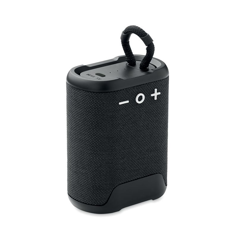 5.0 wireless speaker in ABS with 30 % hemp and 70% polyester fabric finish, IPX7 splash proof with handle. 1 Rechargeable Li-Ion 1800 mAh battery. Output data: 5W, 4 Ohm. Playing time approx. 8h.