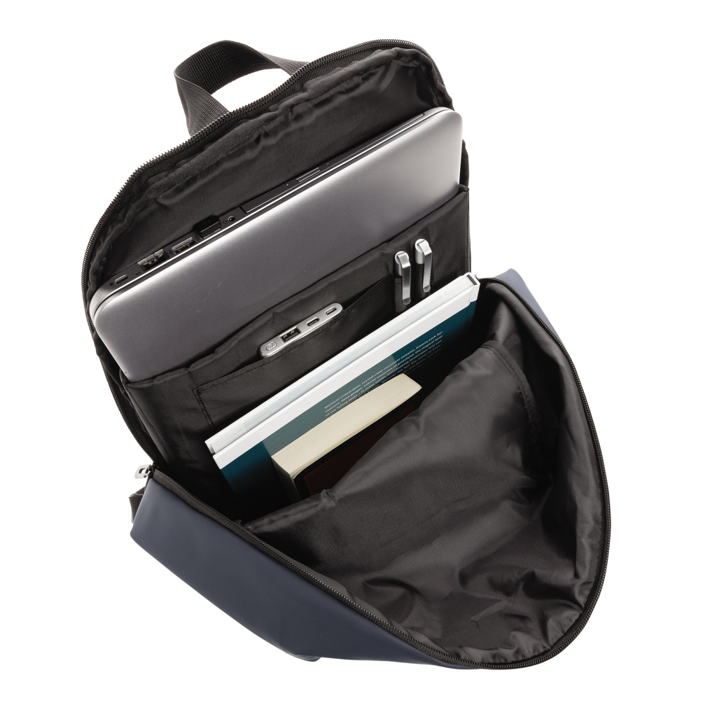 This minimalist, modern backpack made of smooth PU is fully lined and features an inner 15.6 inch laptop compartment, a spacious main compartment and 2 inner pockets and 2 pen loops. Mesh padded back and adjustable straps. Exterior 100% PU. Interior 100% 210D polyester. PVC free.