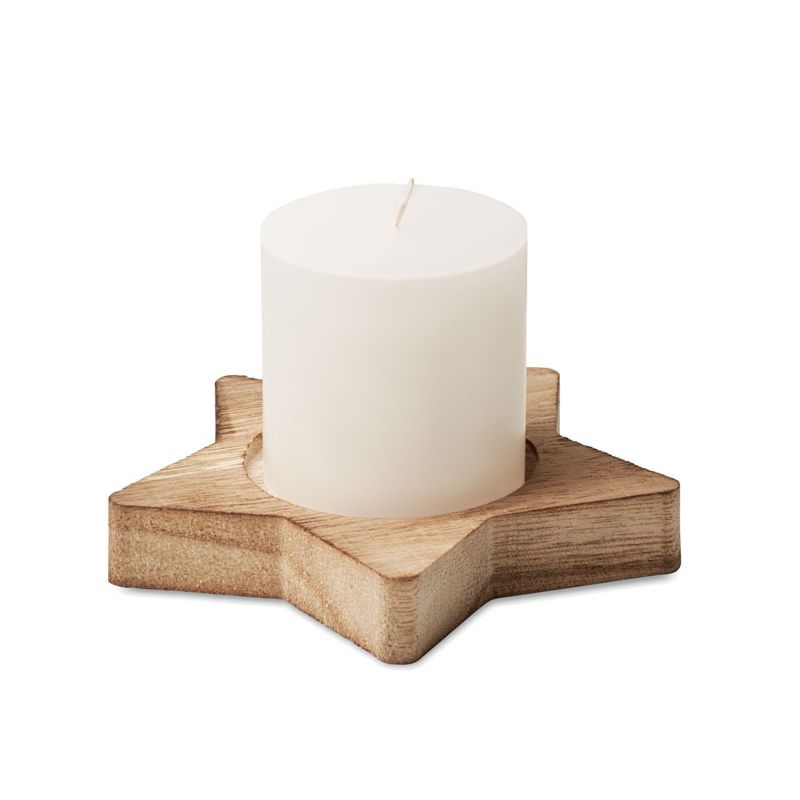 Star shaped wooden decorative base with vanilla fragranced candle.