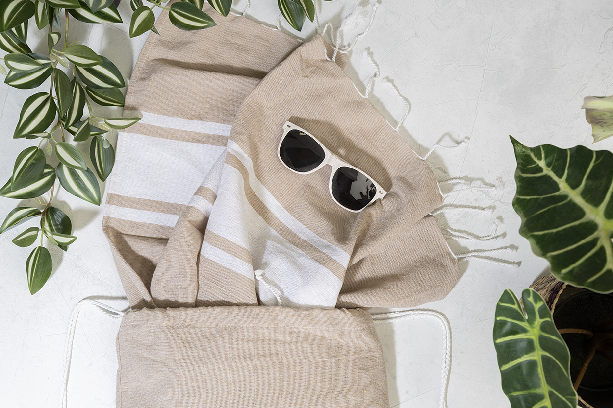 recycled cotton beach towel and drawstring bag