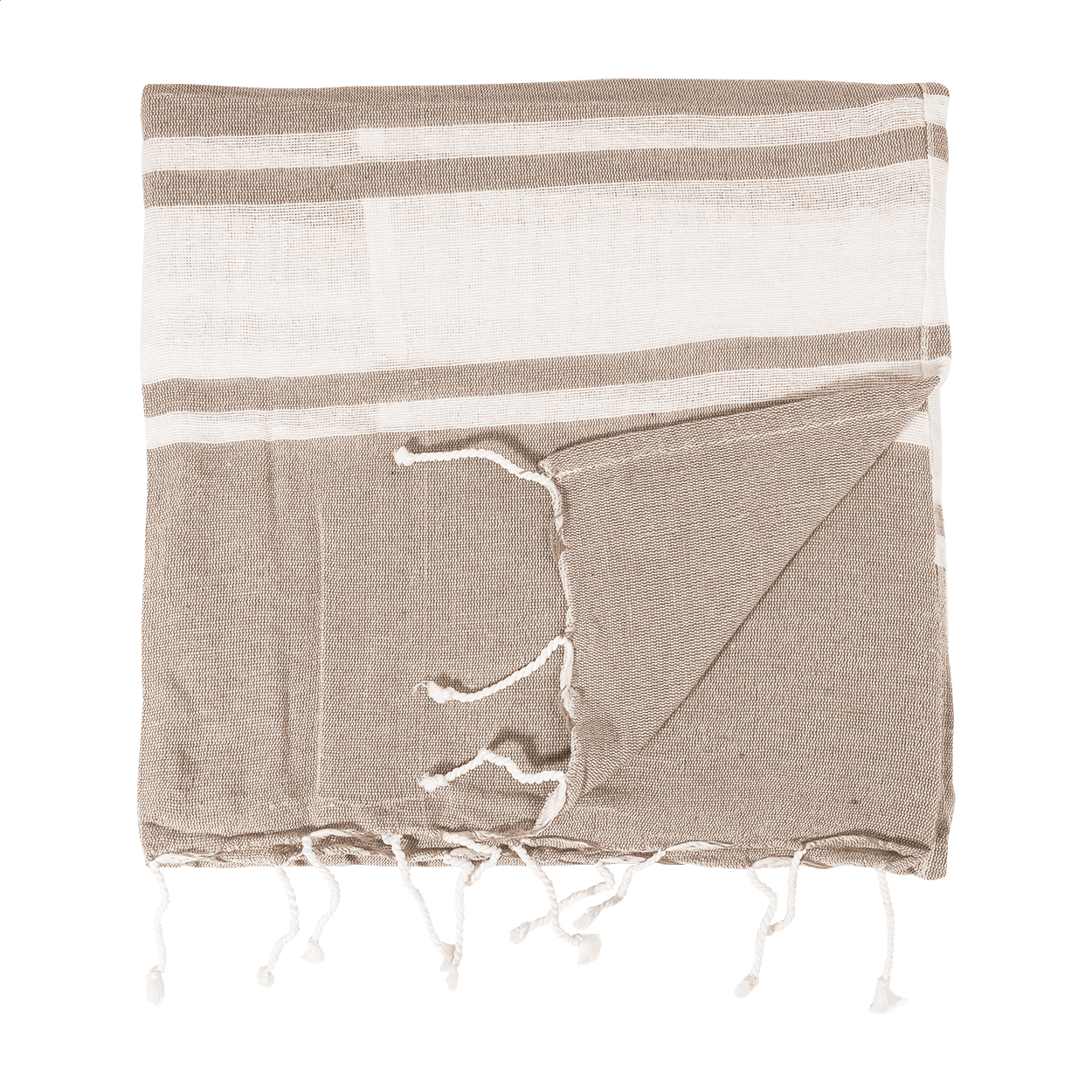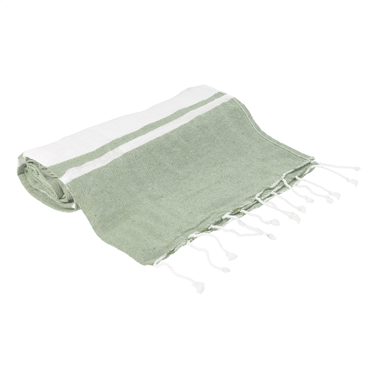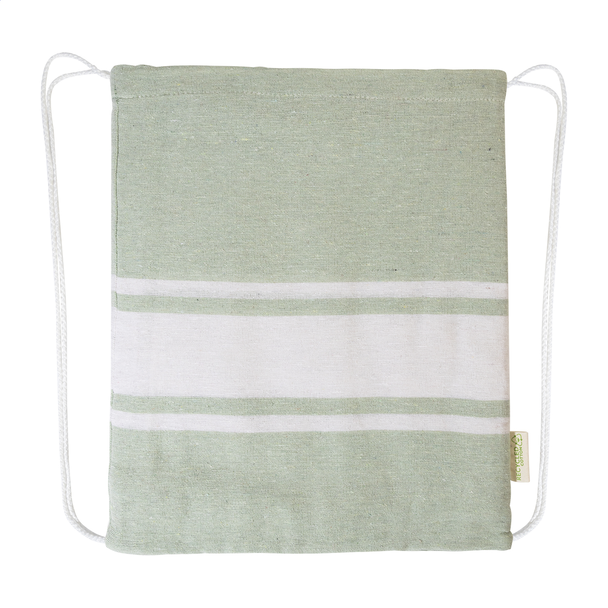 Two-tone pareo beach towel with integrated drawstring bag. 70% recycled cotton and 30% RPET polyester, 180 g/m².