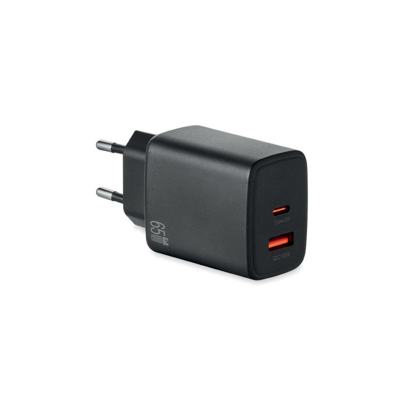 EU 2-pole GaN wall charger with 65W quick charge, 1 USB-A and 1 Type-C ports. Supports Power Delivery technology. Ideal travel item.