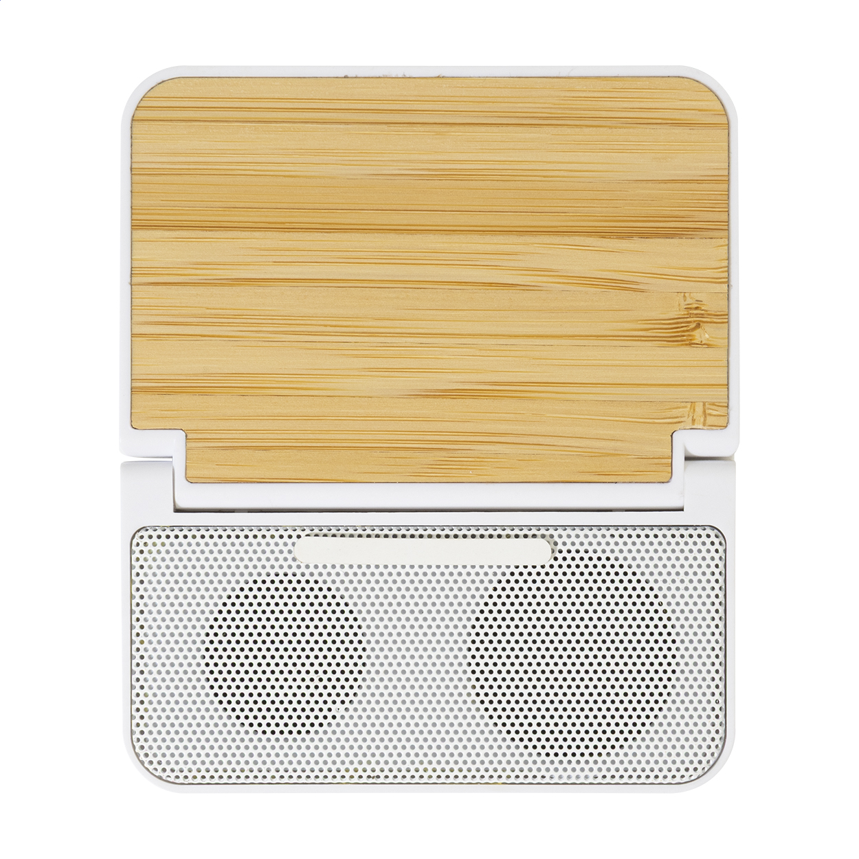 Recycled ABS wireless speaker with bamboo covered mobile holder and built-in wireless fast charger (15W). With built-in rechargeable battery (1200 mAh). Including USB charger cable.