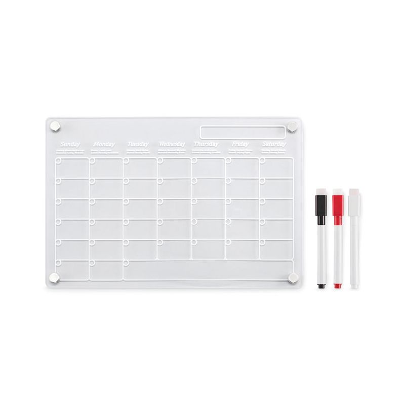 Magnetski mjesečni planer u A4 formatu od akrila s 3 magnetna markera za brisanje (crni, crveni i bijeli). Uključeni vijci za montažu.