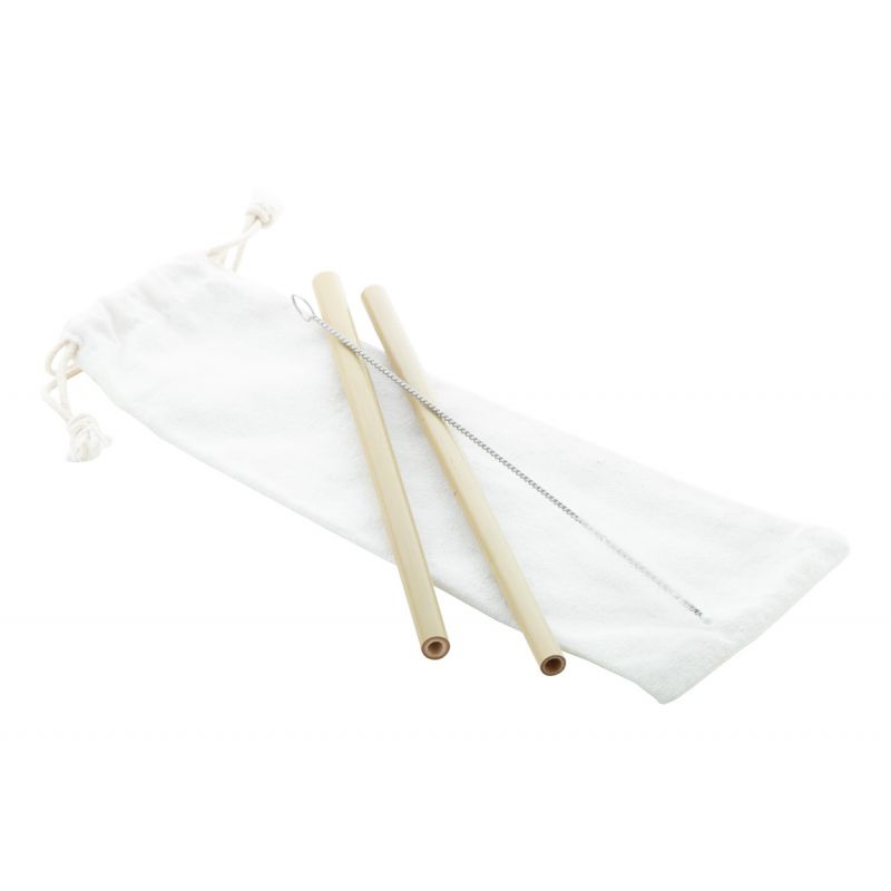 Set of 2 reusable natural bamboo drinking straws and cleaning brush in cotton pouch. The diameter and surface of the straws may vary.