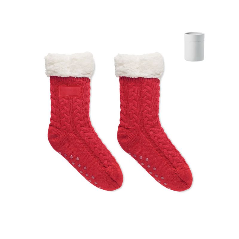 Pair of cable knit slipper socks with non-slip grippers on the bottom in Acrylic twine and 240 gr/m² faux sherpa lining. Presented in giftbox. Size M= 36-39.