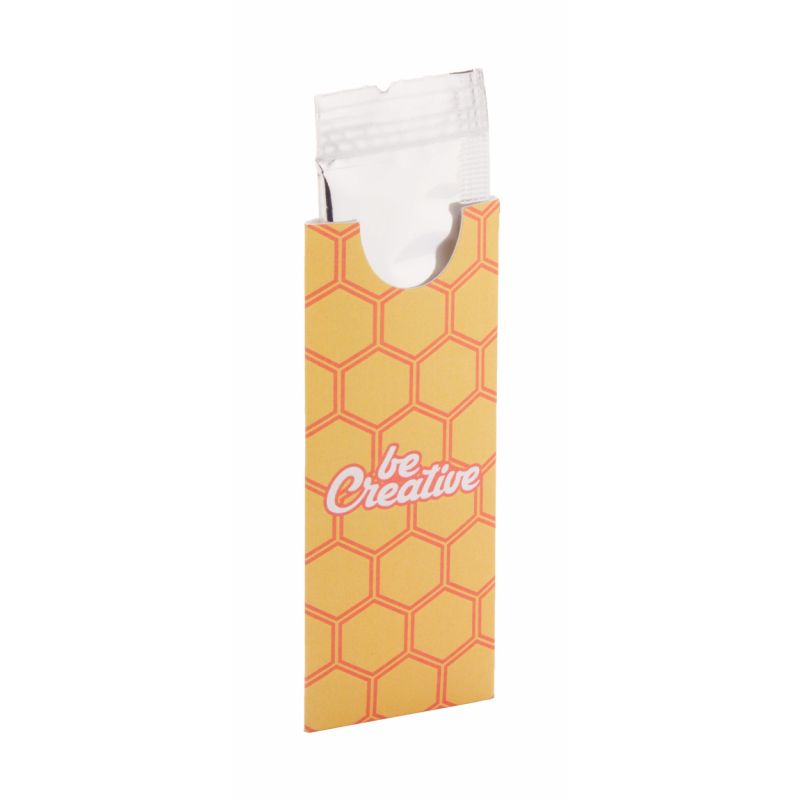 One single serve packet of honey (10 grams) in custom made, full colour printed paper sleeve. MOQ: 100 pcs.