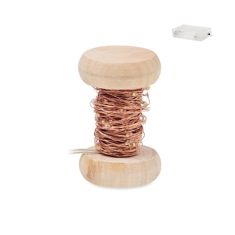 String of 50 LED fairy lights in warm yellow light on a wooden spool. Length: 5m. 3 AA batteries not included.