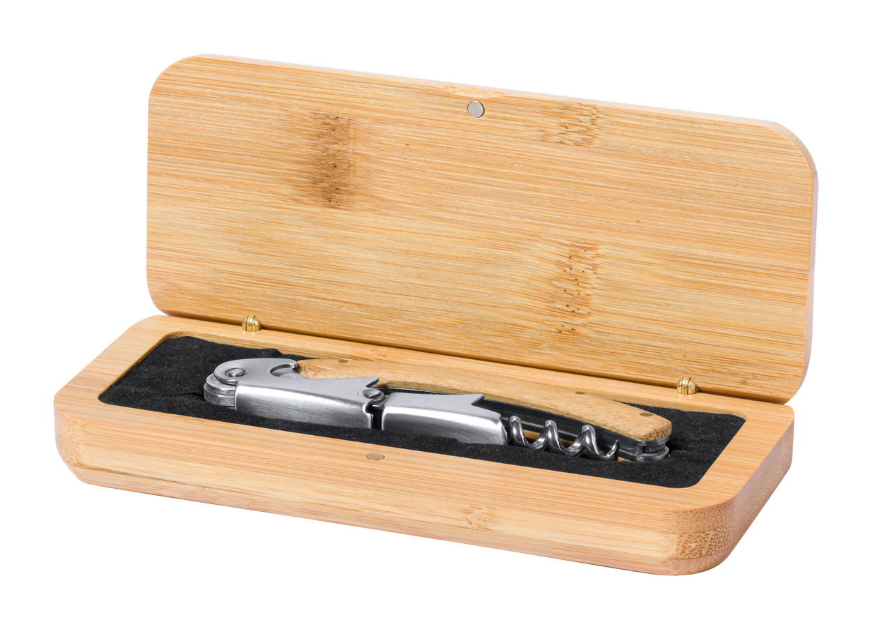 Stainless steel corkscrew with bottle opener and bamboo handle, in bamboo box.