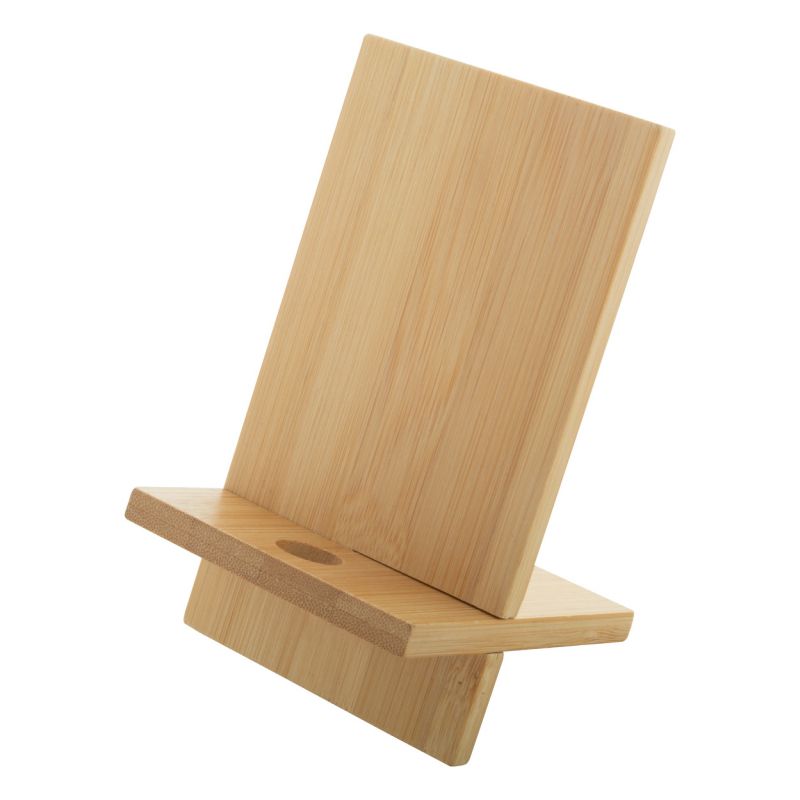 Desk mobile phone holder in bamboo. With cable routing hole for convenient charging. Delivered flat-packed.