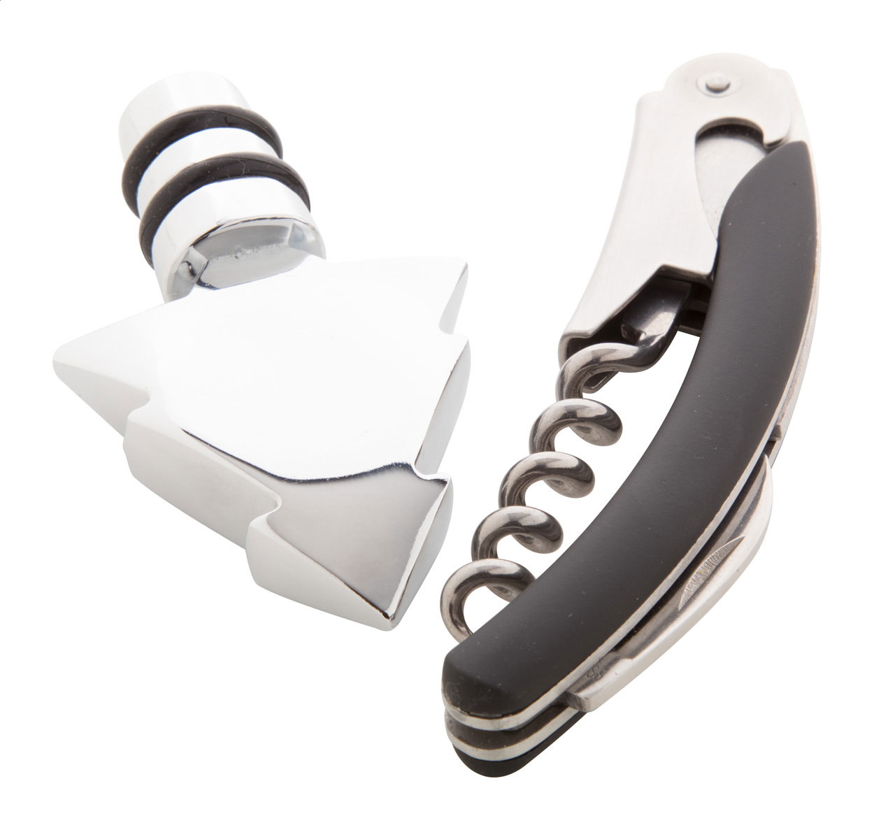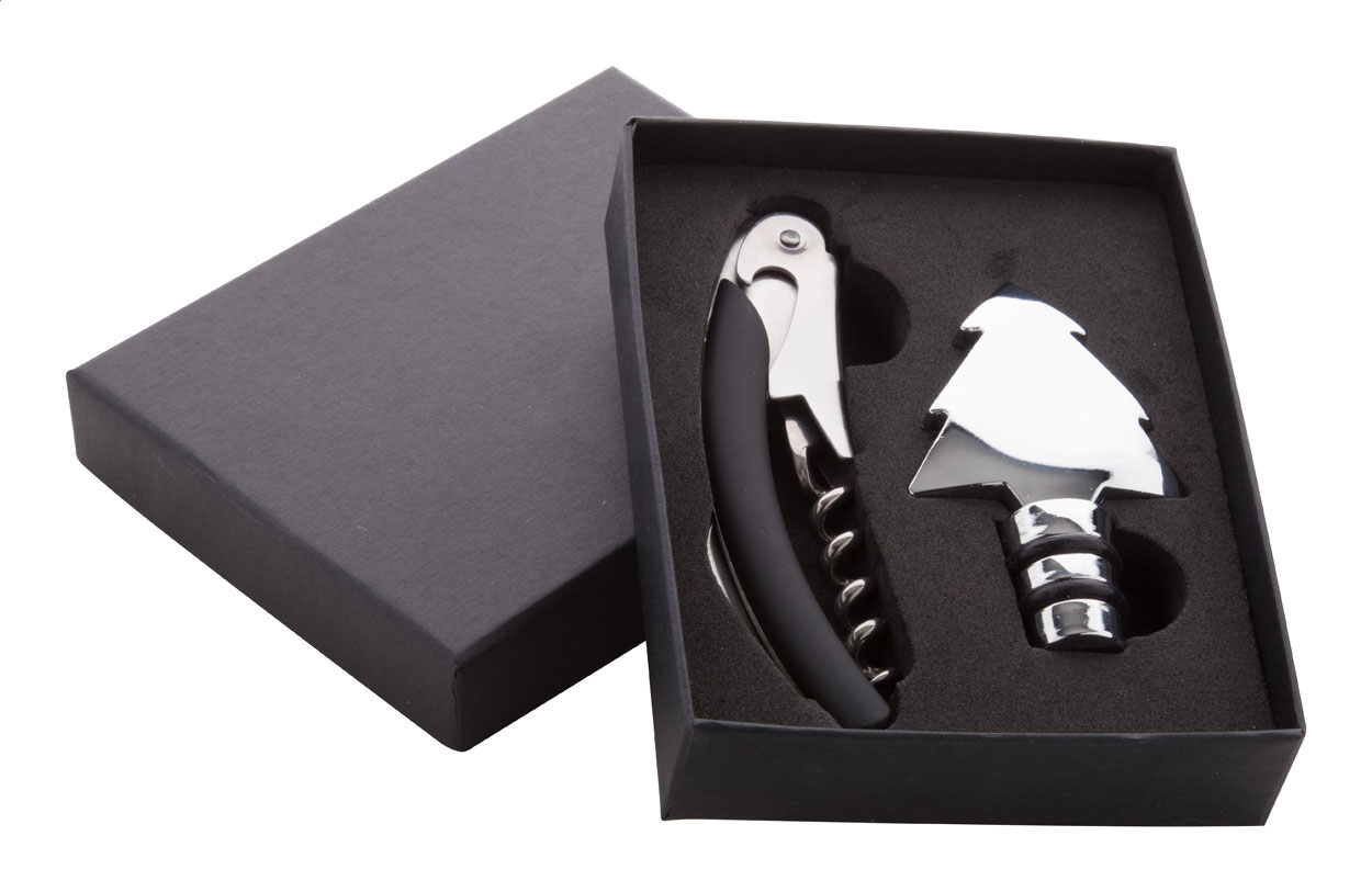 Wine set with corkscrew and cork with Christmas tree on the top. In black gift box.