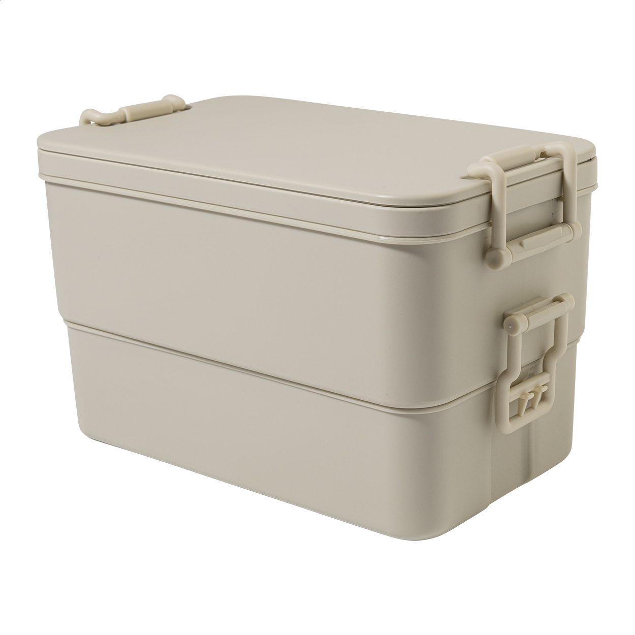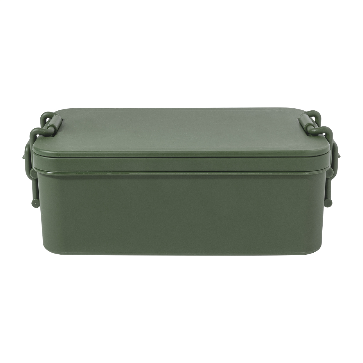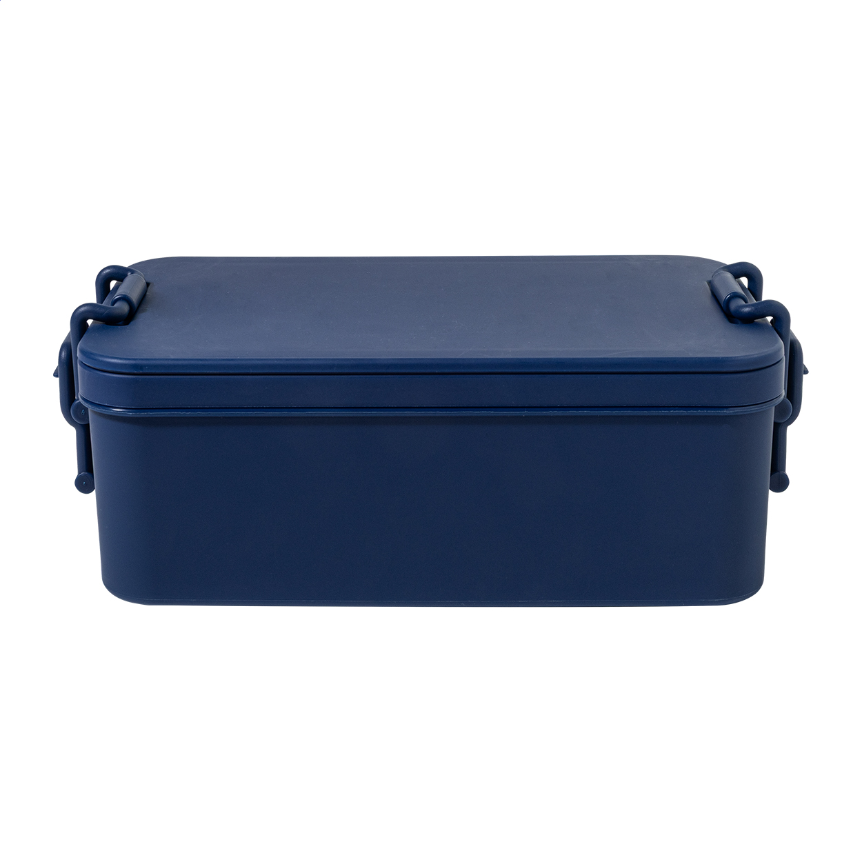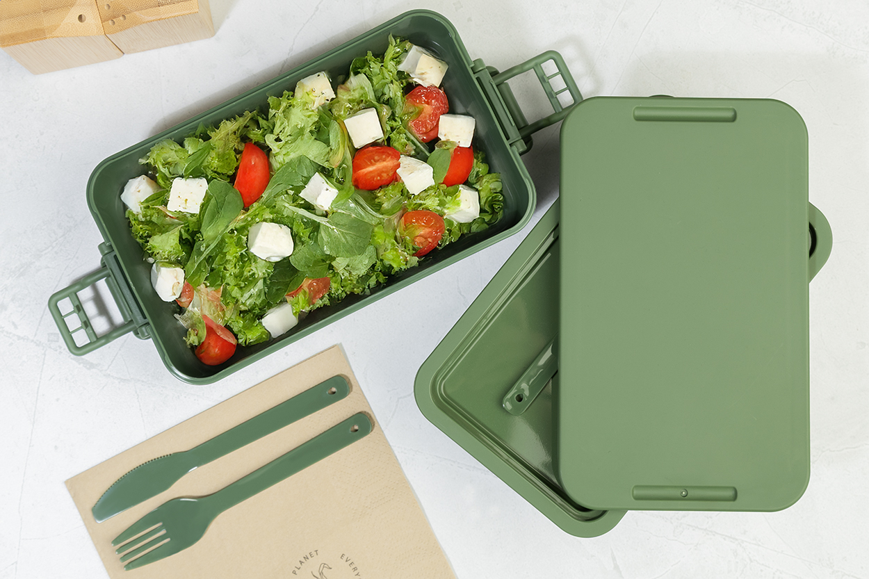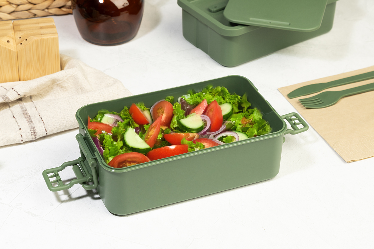 Lunch box in PP plastic with cutlery set (fork, spoon and knife), buckle closure and 2 compartments (1000 ml & 800ml). Stackable design for compact storage.