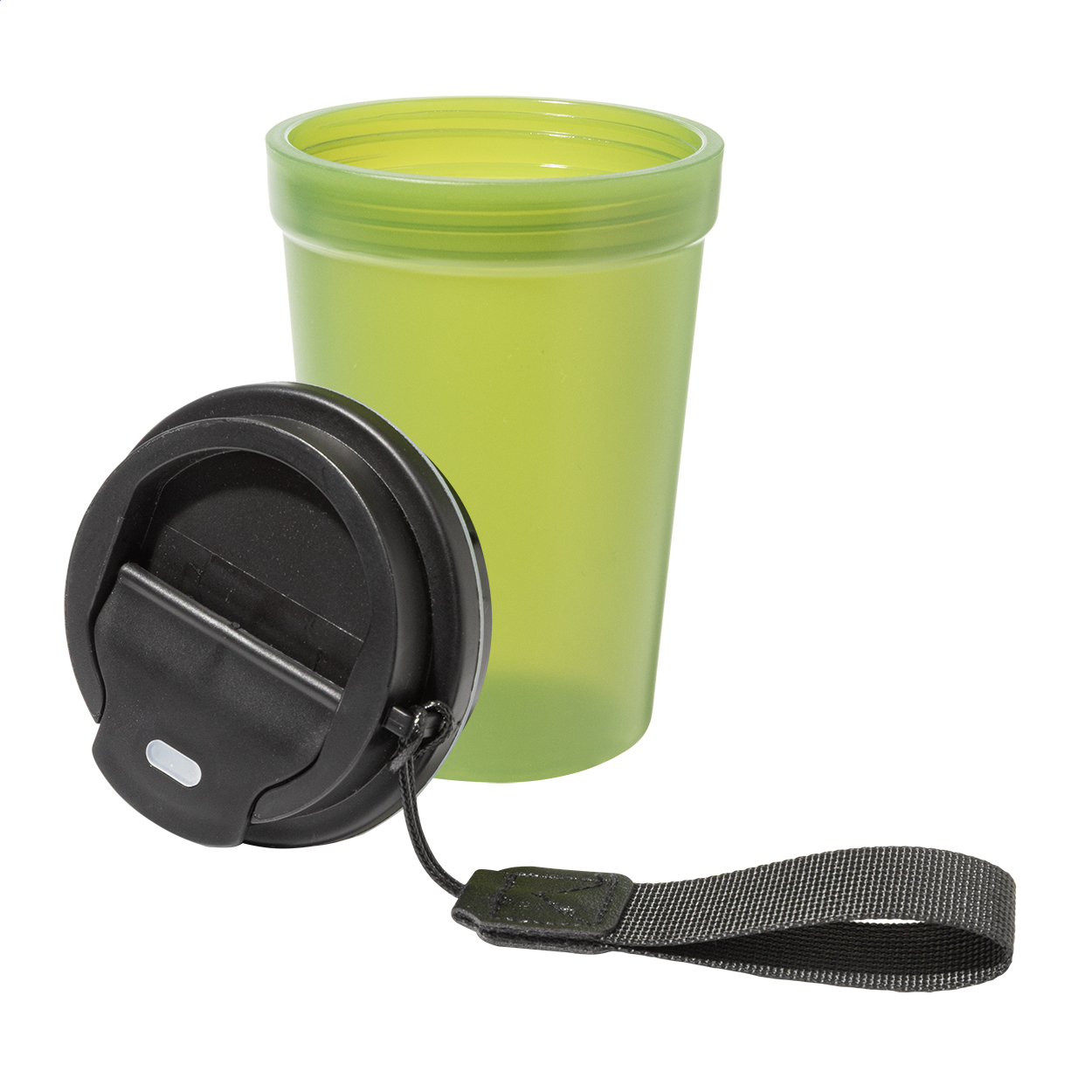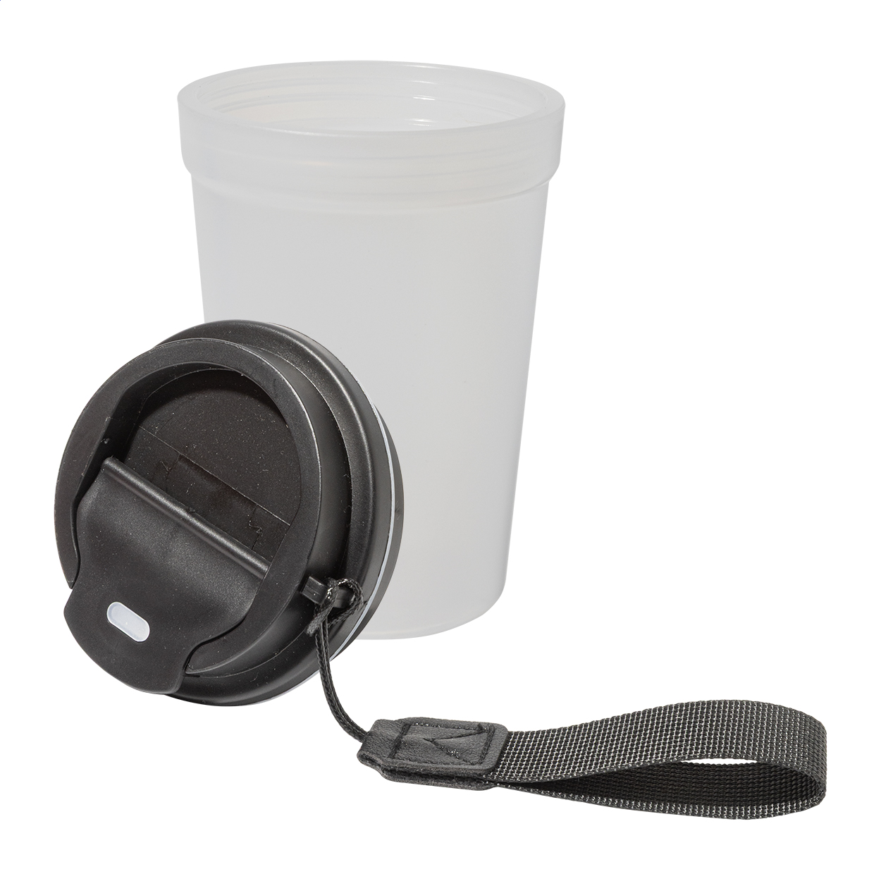 Single-wall, frosted finish PP plastic travel cup with drinking lid and RPET polyester carry strap. 400 ml.