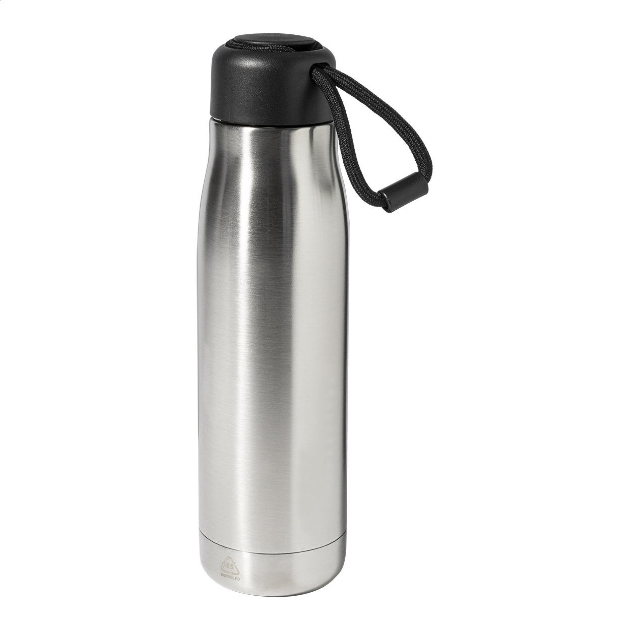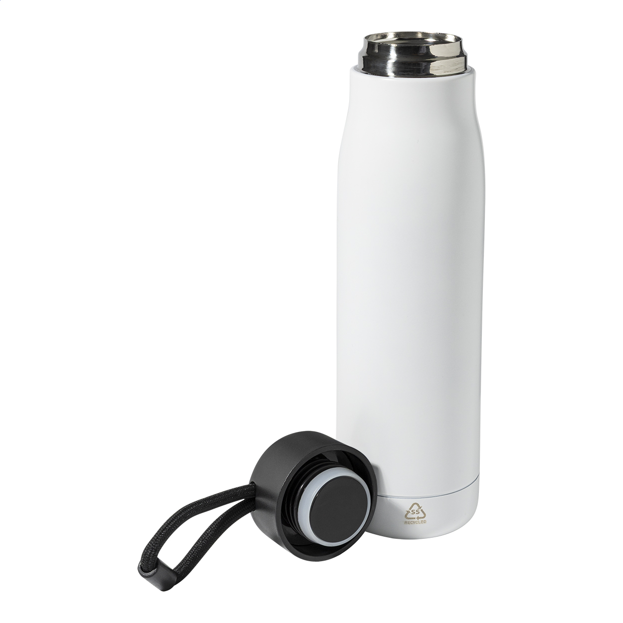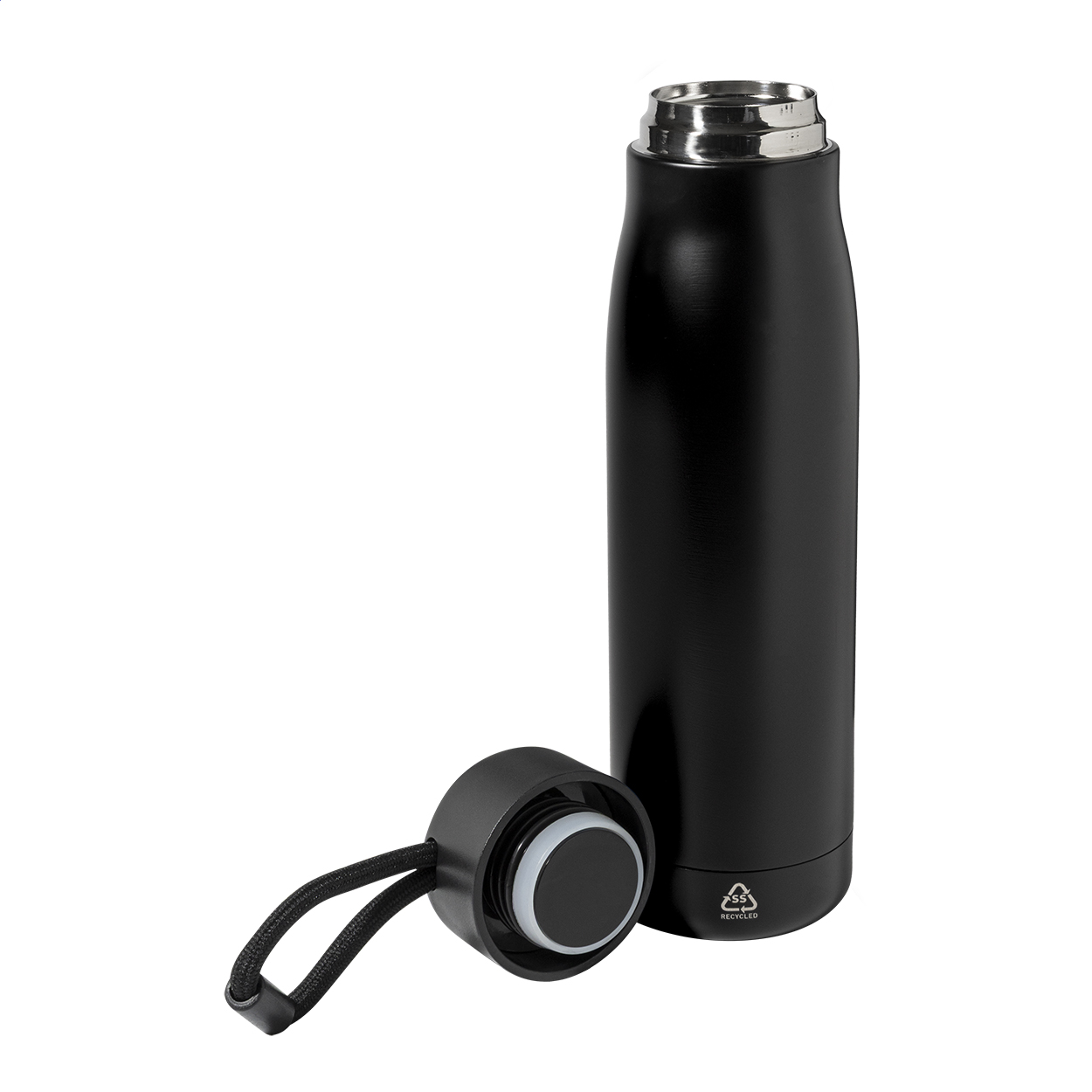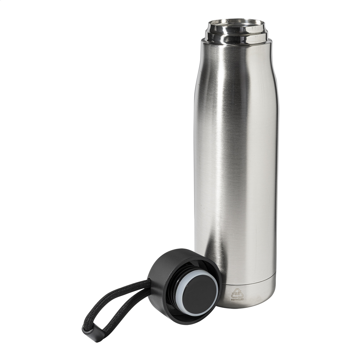 Double-wall, recycled stainless steel vacuum insulated bottle with PP lid and integrated cord carry strap. 500 ml.