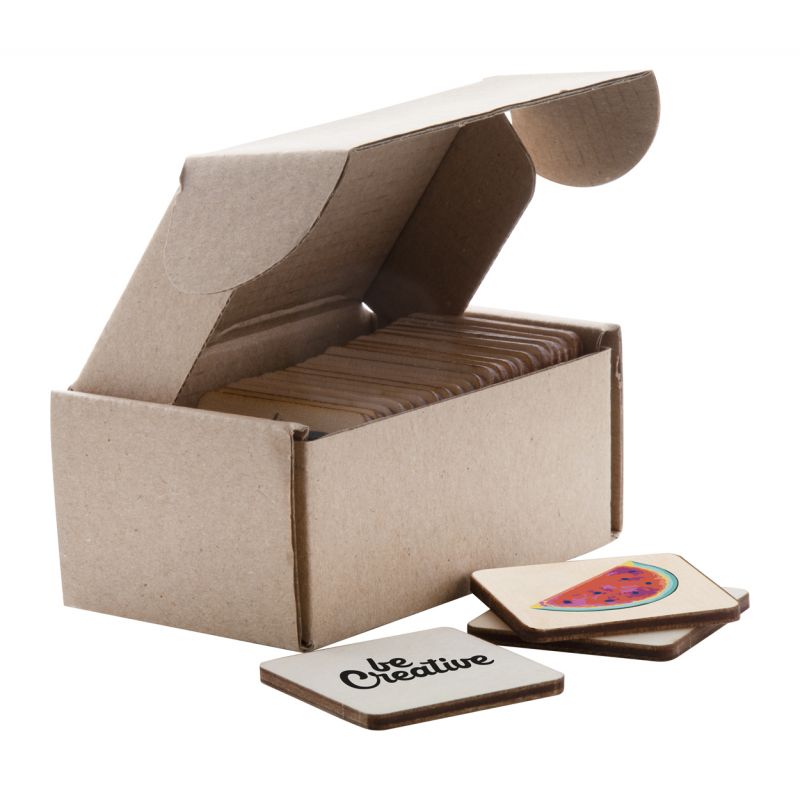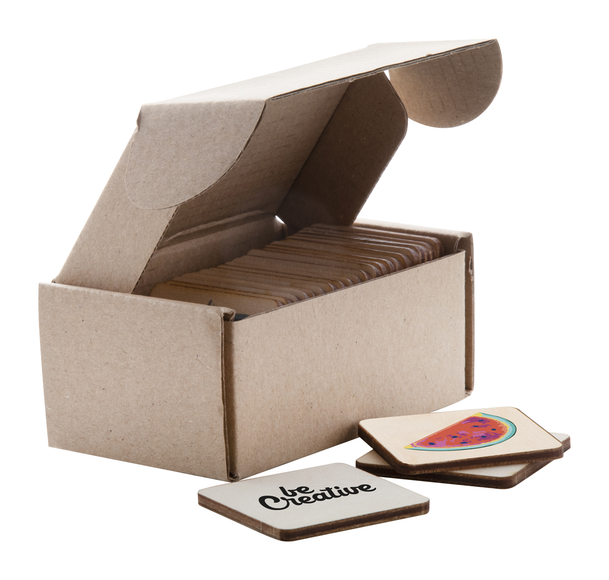 Laminated birch wood memory game with custom graphics. With 24 tiles (40x40 mm). Price includes 12 different full colour print on front side of tiles and 1 colour logo print on backside of all tiles. MOQ: 250 pcs.
