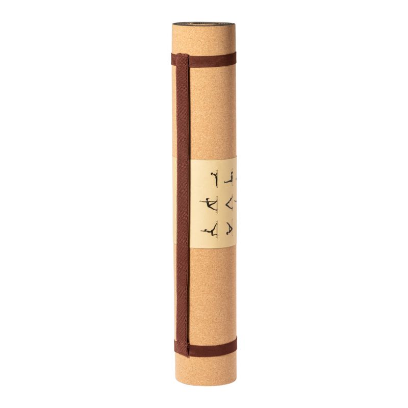 Natural cork yoga mat with kraft paper sleeve and carry strap.