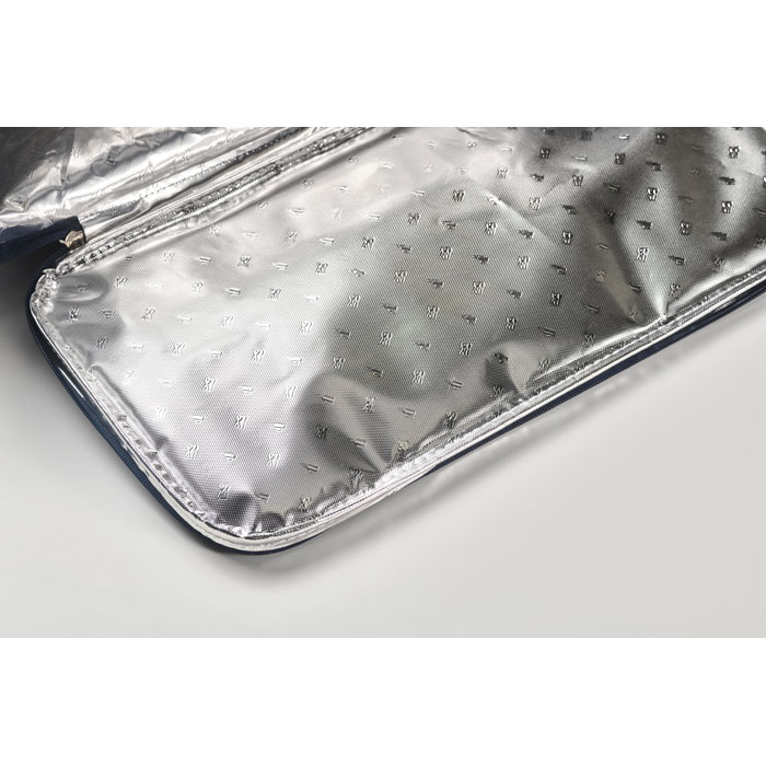 Piknik rashladna torba od 600D RPET poliestera za 2 osobe s prednjim džepom s patentnim zatvaračem. Uključuje pribor za jelo od nehrđajućeg čelika, 2 tanjura od PS-a, 2 čaše od PS-a i 2 pamučne salvete. Zapremina: 18 L.