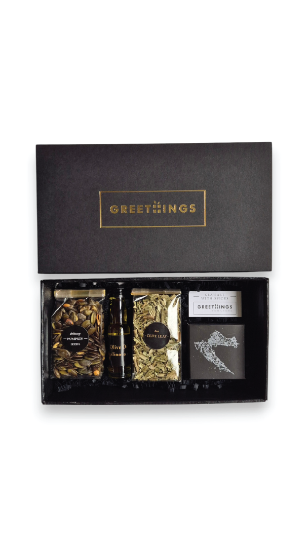 Poklon paket „Mediteranski okusi” spaja najbolje od hrvatske tradicije i mediteranske prehrane. U elegantnom pakiranju nalaze se ekstra djevičansko maslinovo ulje, aromatični čaj od lista masline, začinska sol s dalmatinskim začinima te hrskave slane bučine sjemenke. Ovaj paket savršen je izbor za one koji žele darovati zdravlje, prirodne proizvode i okus Mediterana. Idealan je kao poslovni poklon koji ostavlja snažan dojam, ali i kao božićni poklon za obitelj i prijatelje.