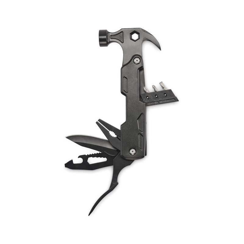 Višenamjenski alat – čekić 14-u-1 od nehrđajućeg čelika. Uključuje izvlakač čavala, imbus ključ, nazubljeni nož, čeličnu turpiju, razne odvijače, kliješta, šiljata kliješta, otvarač za boce, nož i rezač žice.
