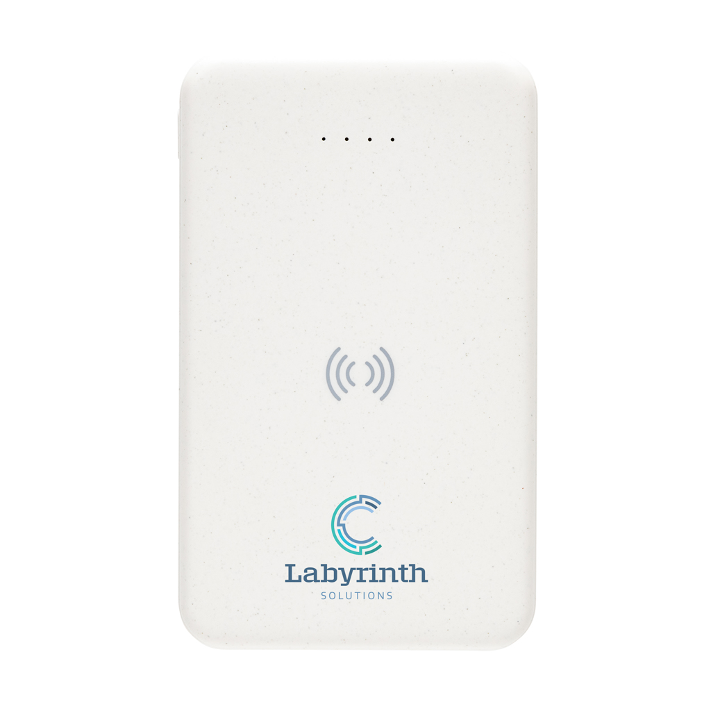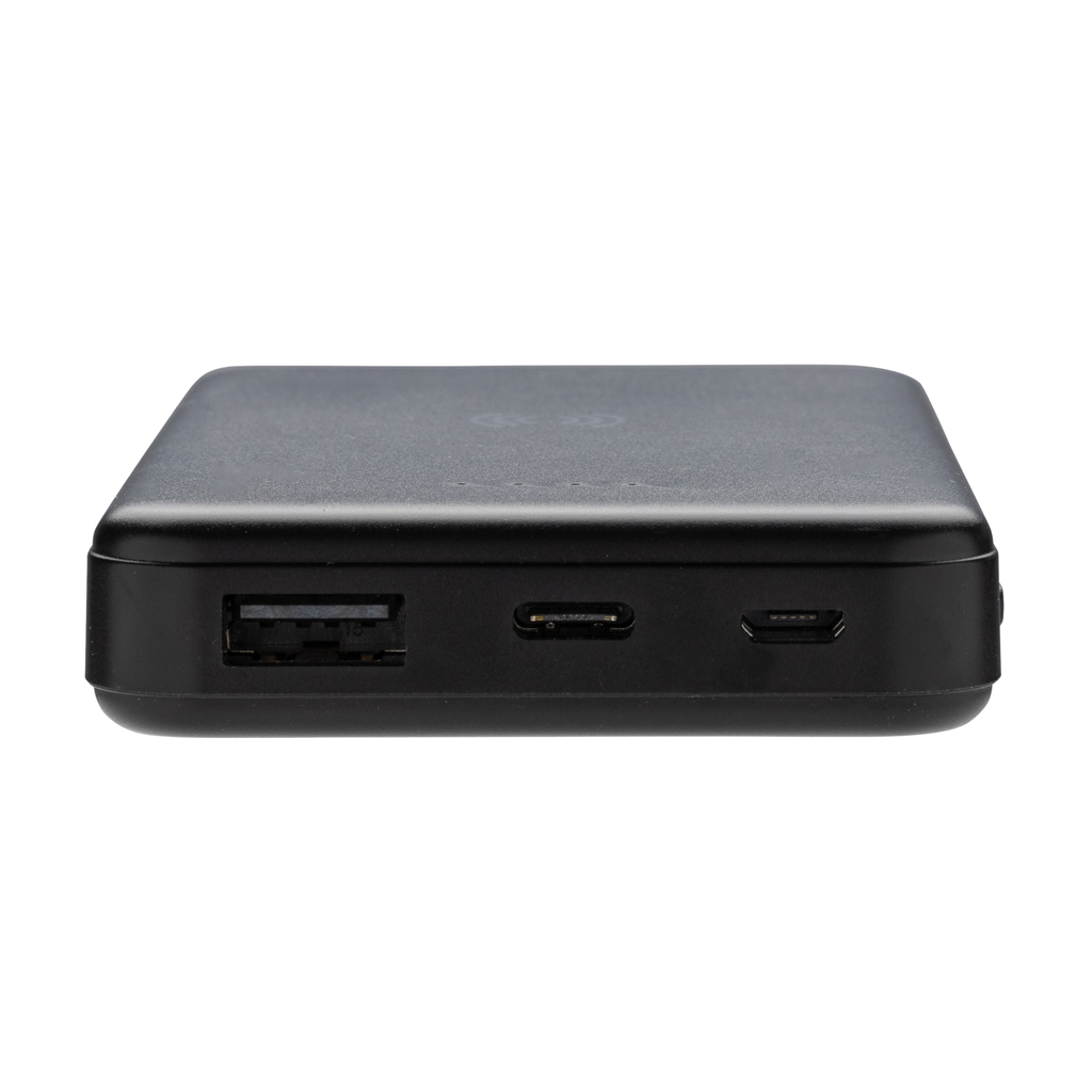 Powerbank džepne veličine od 5.000 mAh s bežičnim punjačem od 5 W gdje je kućište izrađeno od reciklirane ABS plastike s RCS certifikatom. RCS (Recycled Claim Standard) standard je za provjeru recikliranog sadržaja proizvoda u cijelom opskrbnom lancu. Ukupni reciklirani sadržaj: 26 % temeljeno na ukupnoj težini predmeta. Kada je potpuno napunjen, powerbank vam daje dovoljno energije za ponovno punjenje vašeg mobilnog telefona do dva puta. Powerbank sadrži dugotrajnu litij-polimersku bateriju visoke gustoće razreda A od 5.000 mAh. Indikatori napajanja pokazat će preostalu razinu energije tako da uvijek znate kada ponovno napuniti. Micro USB ulaz 5V/2A; Tip-C ulaz 5V/2,4A; USB izlaz 5V/2,4A, Tip C izlaz:5V/2A Artikl i dodaci ne sadrže PVC. Uključujući RCS certificirani reciklirani TPE kabel za punjenje. Pakirano u FSC® mix ambalažu.