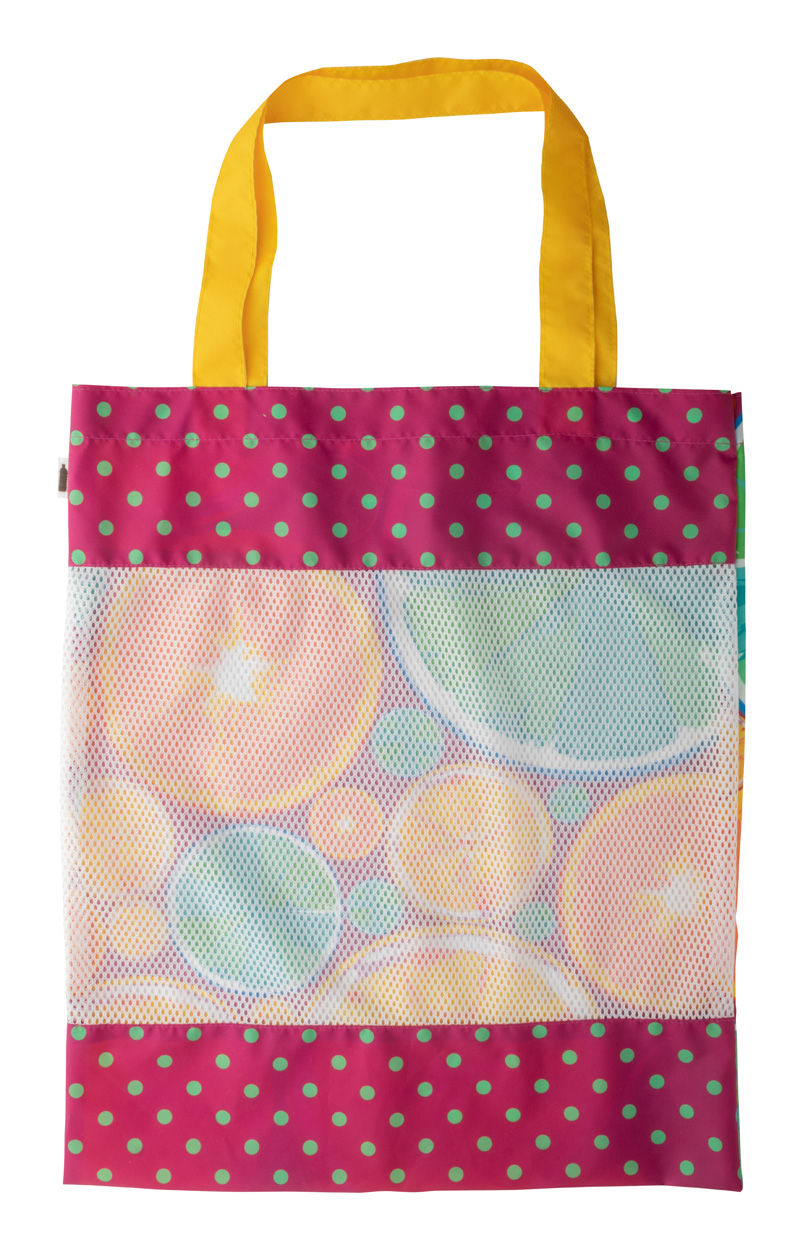 Custom made shopping bag in 190T RPET polyester, with polyester mesh front and long handles. With all over sublimation printed graphics (excluding mesh part) and distinctive RPET label. MOQ: 50 pcs.