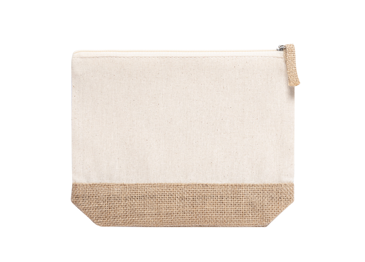 Zipped cosmetic bag in cotton and laminated jute.