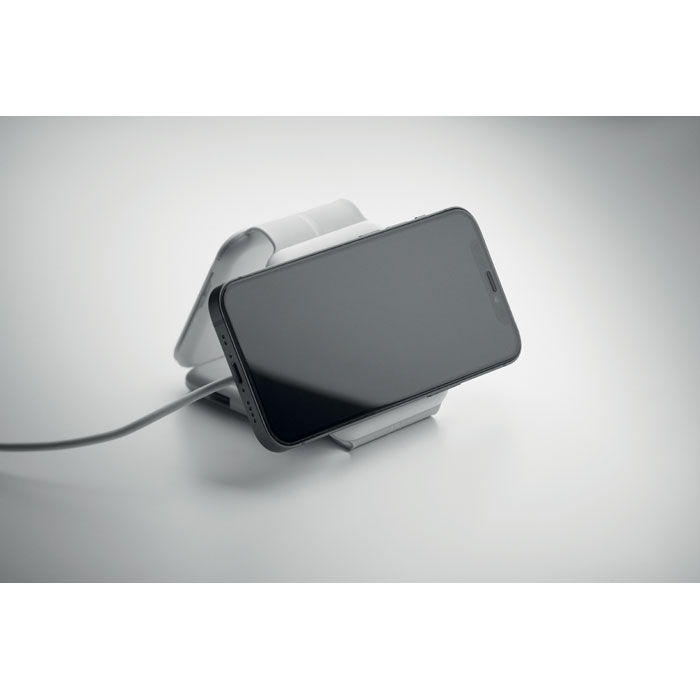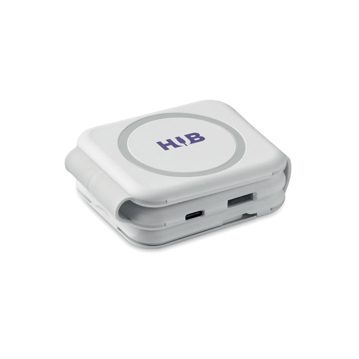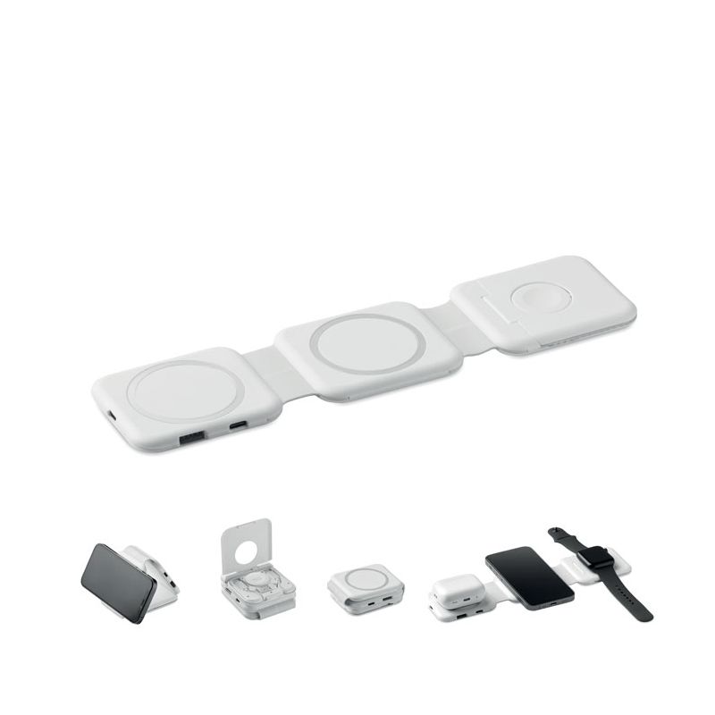 Magnetska stanica za punjenje od ABS-a. 3 bežične stanice za punjenje: 1 × 15 W, 1 × 5 W za TWS i 1 punjač za Apple Watch (3 W). 2 Type-C i 2 USB-A priključka (HUB). Integrirani ulazni kabel: Type-C na USB-A.