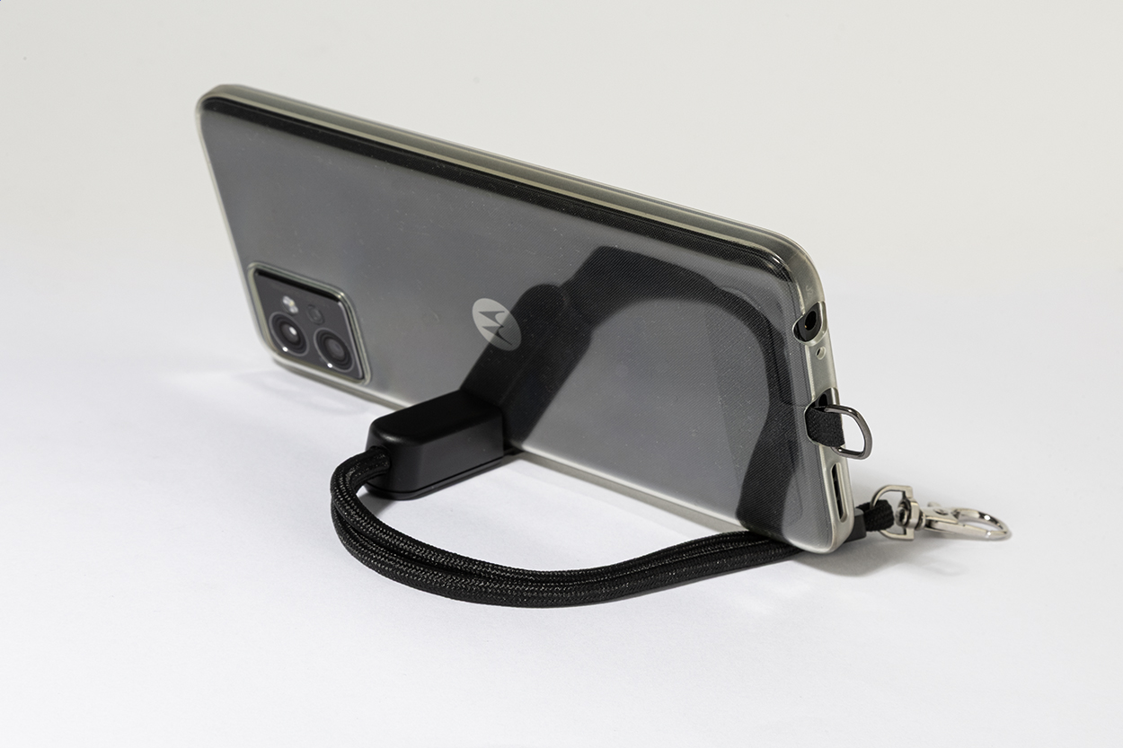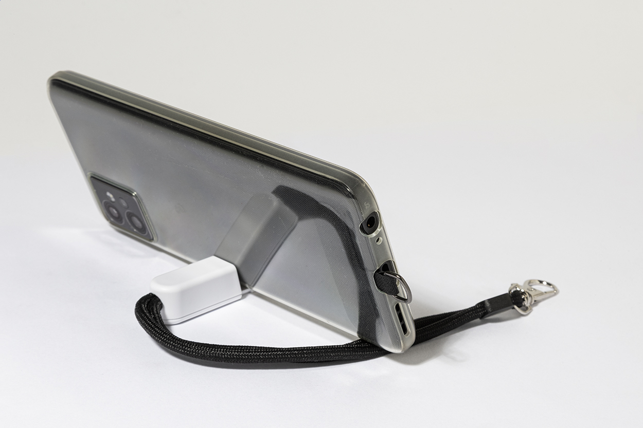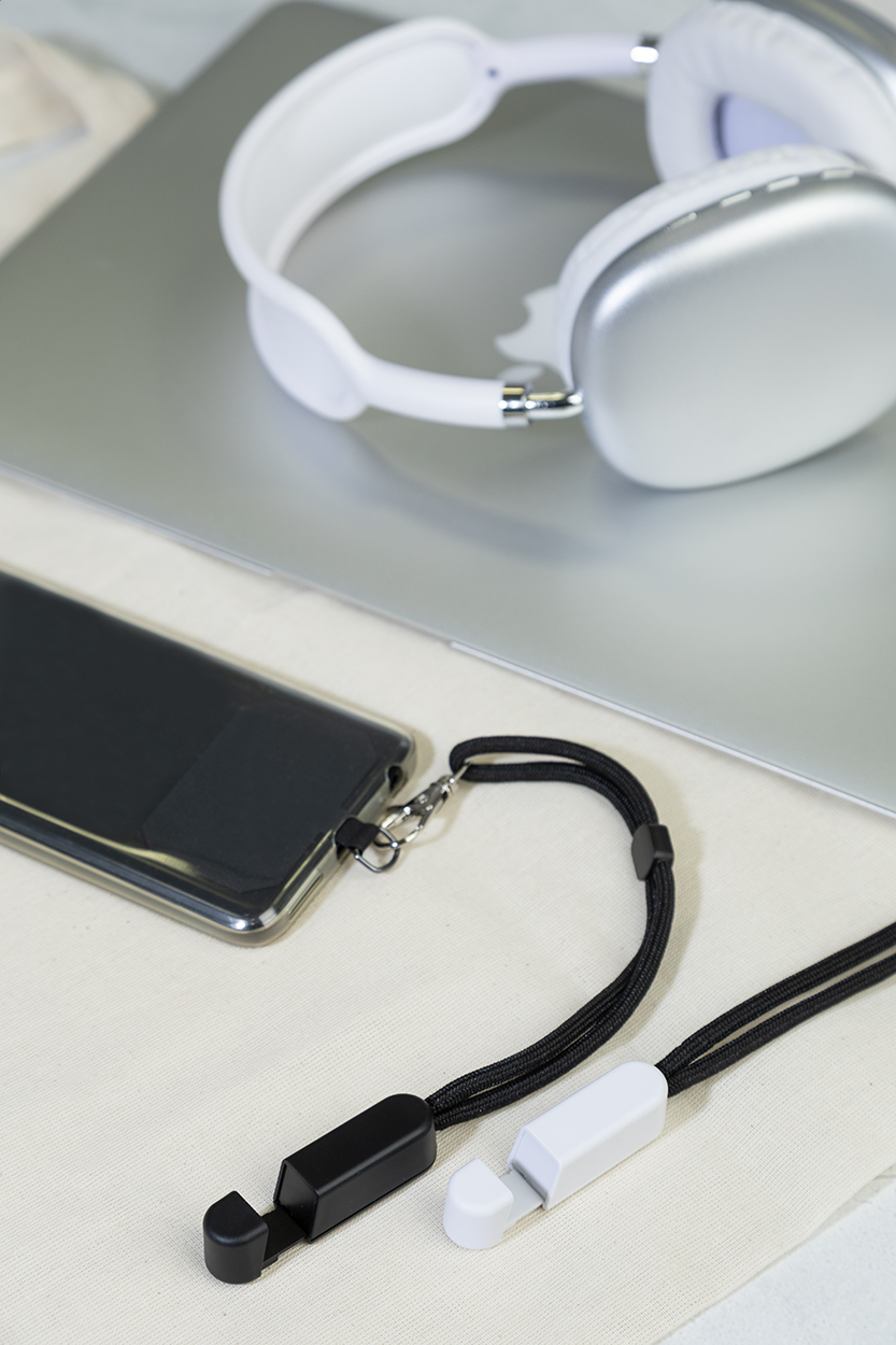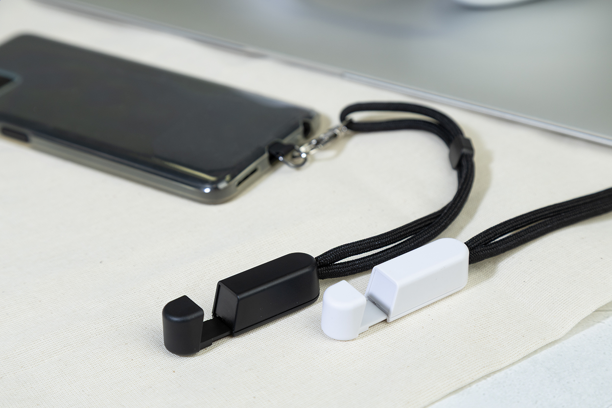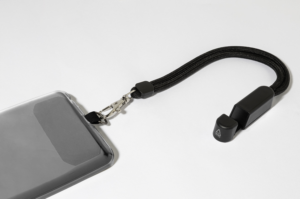 RPET mobile holder wristband with phone insert and recycled ABS desk mobile stand.