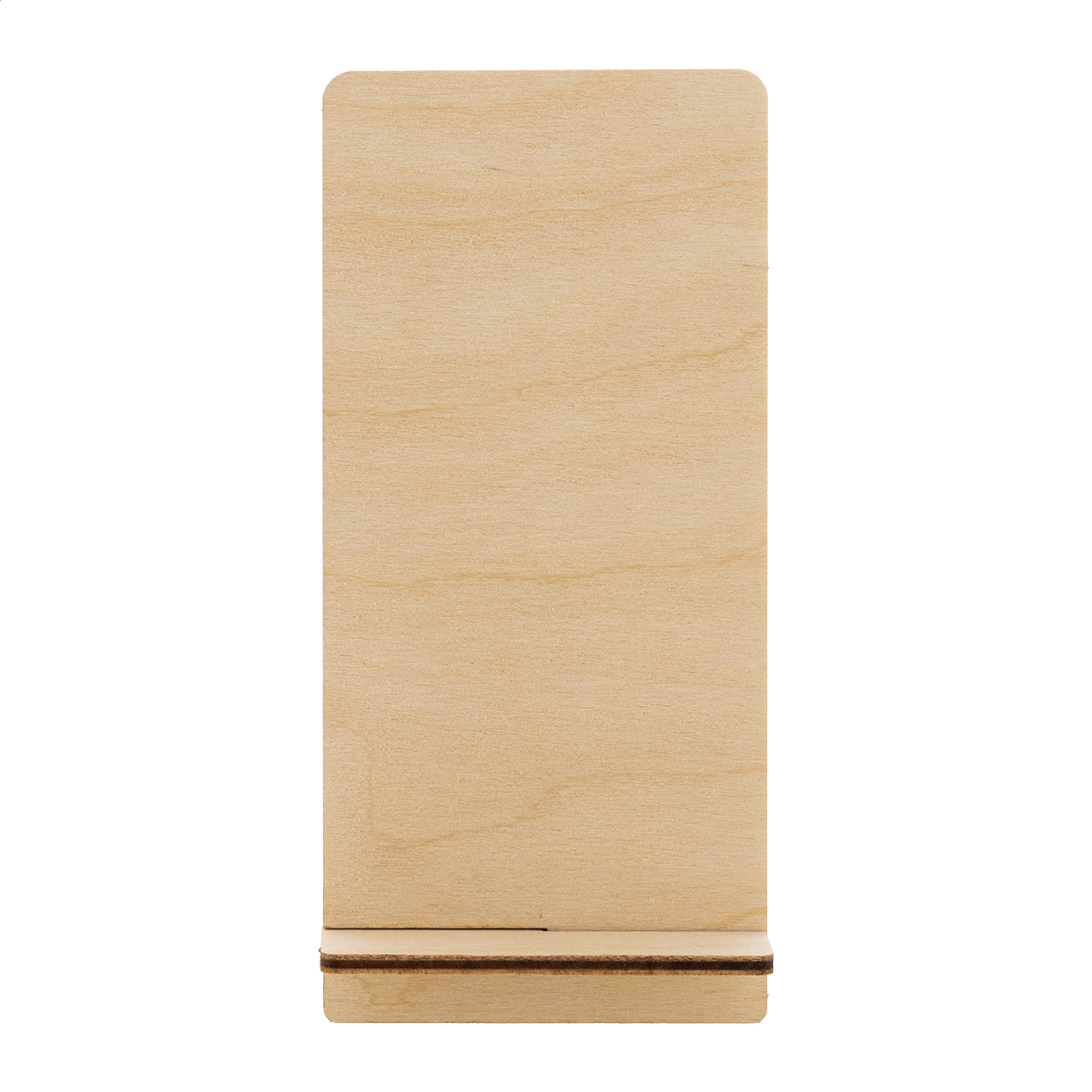 Custom made, full colour printed desk mobile phone holder in birch plywood. Price includes UV LED printing on front side. Delivered flat-packed. MOQ: 50 pcs