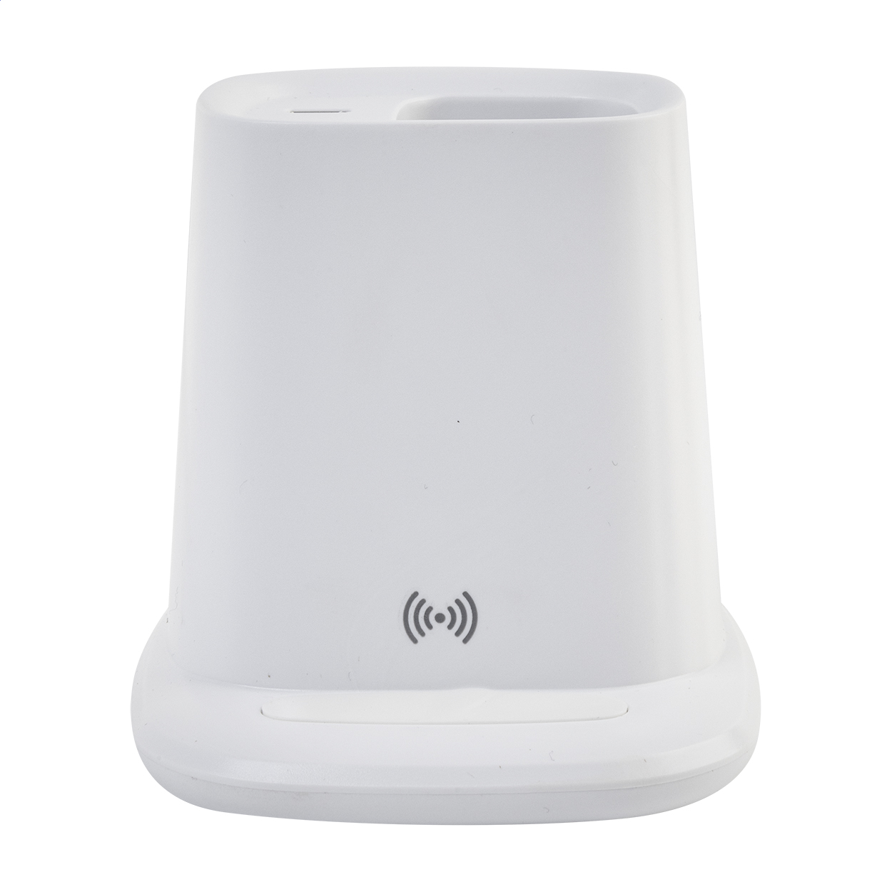 Recycled ABS multifunctional desk pen holder with mobile holder, built-in wireless fast charger (10W), 1 USB and 1 USB-C charger port. Including USB charger cable.
