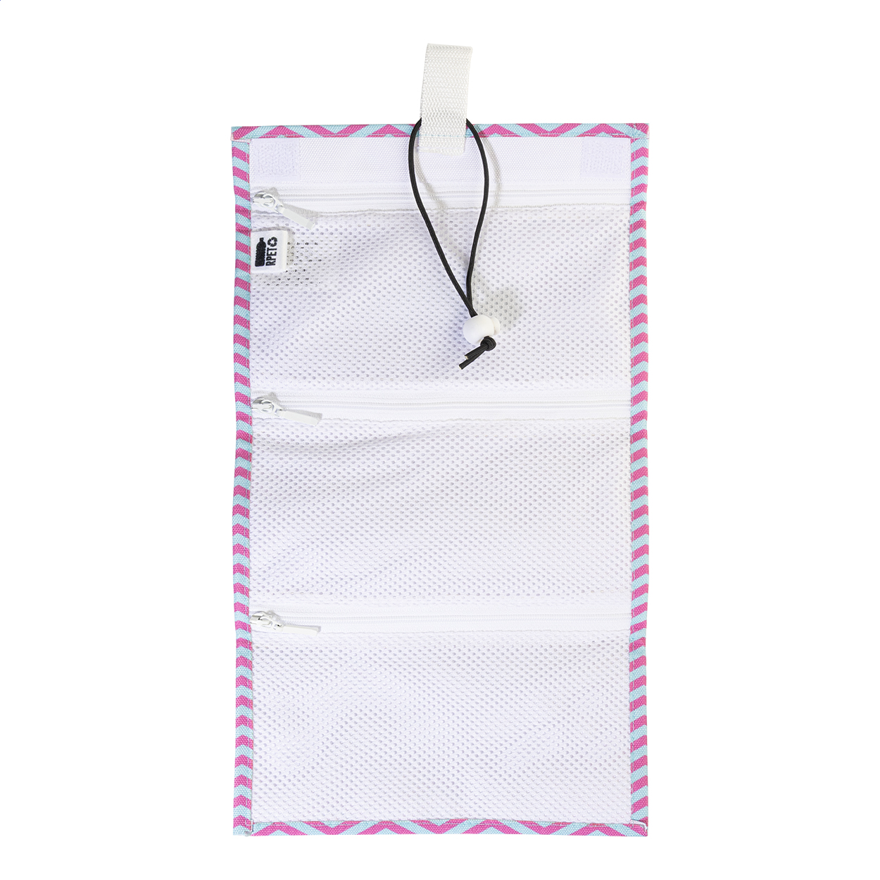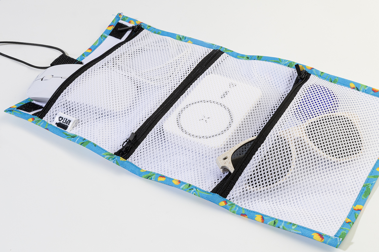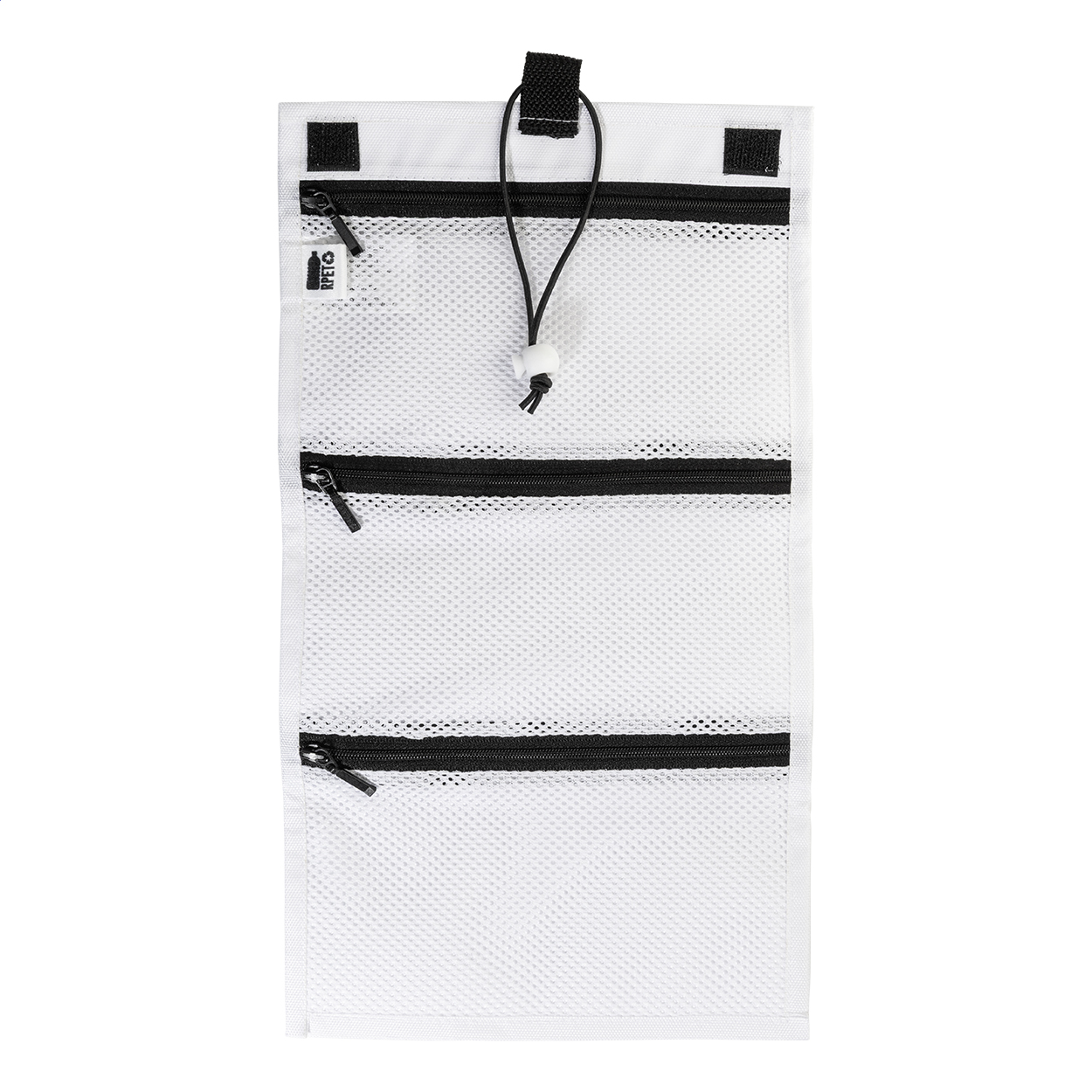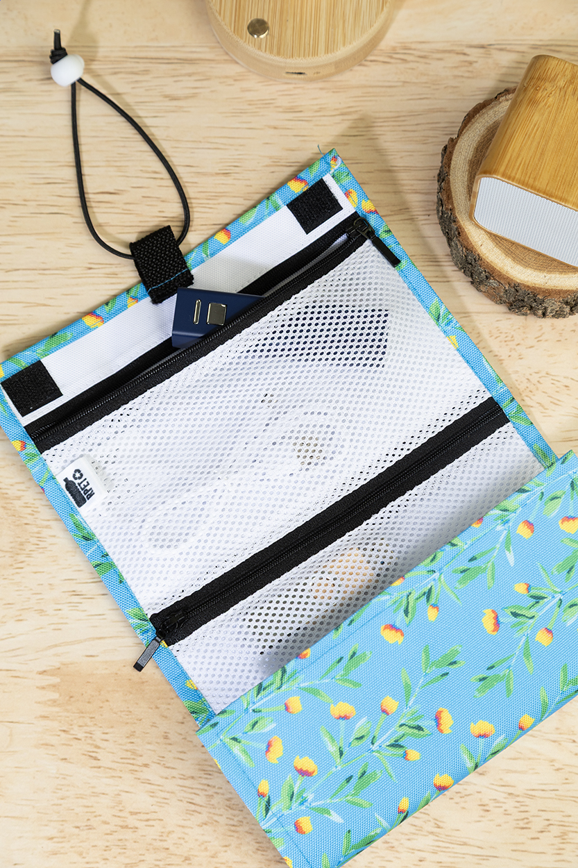 Custom made, RPET cable organizer roll case with 3 zipped mesh compartments and elastic closure strap. With all over sublimation printed graphics. 600D RPET polyester with distinctive RPET label. MOQ: 25 pcs.