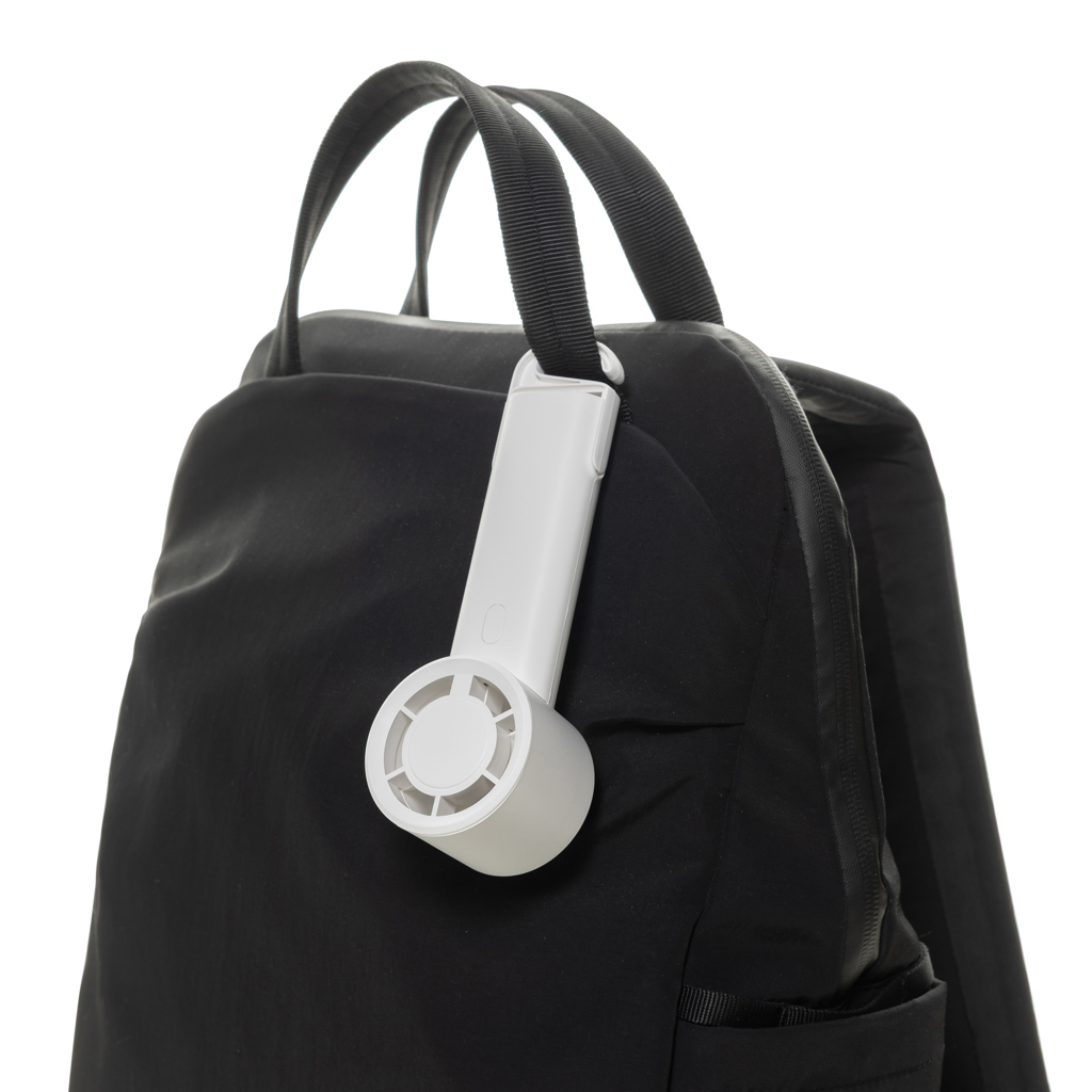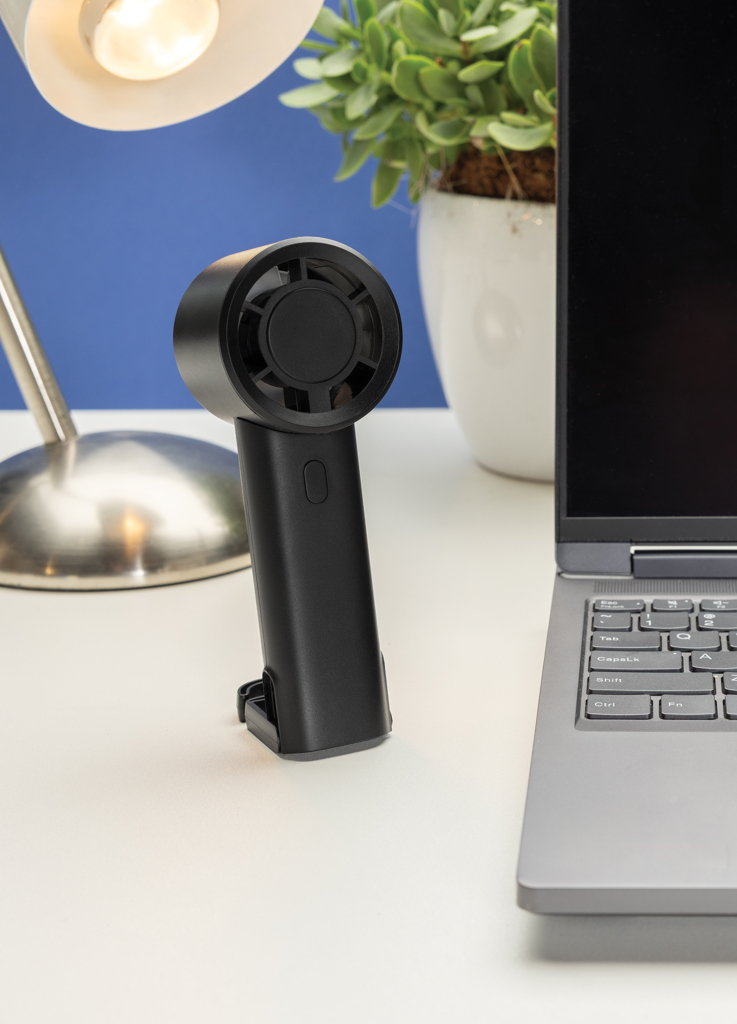 The Twist portable fan, made from RCS certified recycled plastic, is a compact and versatile solution to stay cool anywhere. Its sleek black body, made from 35% RCS recycled ABS, houses a rechargeable 1200 mAh Li-ion battery, providing up to 6 hours of working time with just 3 hours of charging via the included 30 cm black TPE USB-A to USB-C cable. With three adjustable speed levels and an extendable hook that doubles as a stand, the Twist fan is perfect for use at a desk, bedside, or while travelling.The case is made from RCS certified recycled ABS plastic. RCS (Recycled Claim Standard) is a standard to verify the recycled content of a product throughout the whole supply chain. Total recycled content: 35 % based on total item weight. This fan is PVC-free and packaged in an FSC® certified kraft box. Max. power: 2W | Input current: 5V / 1A