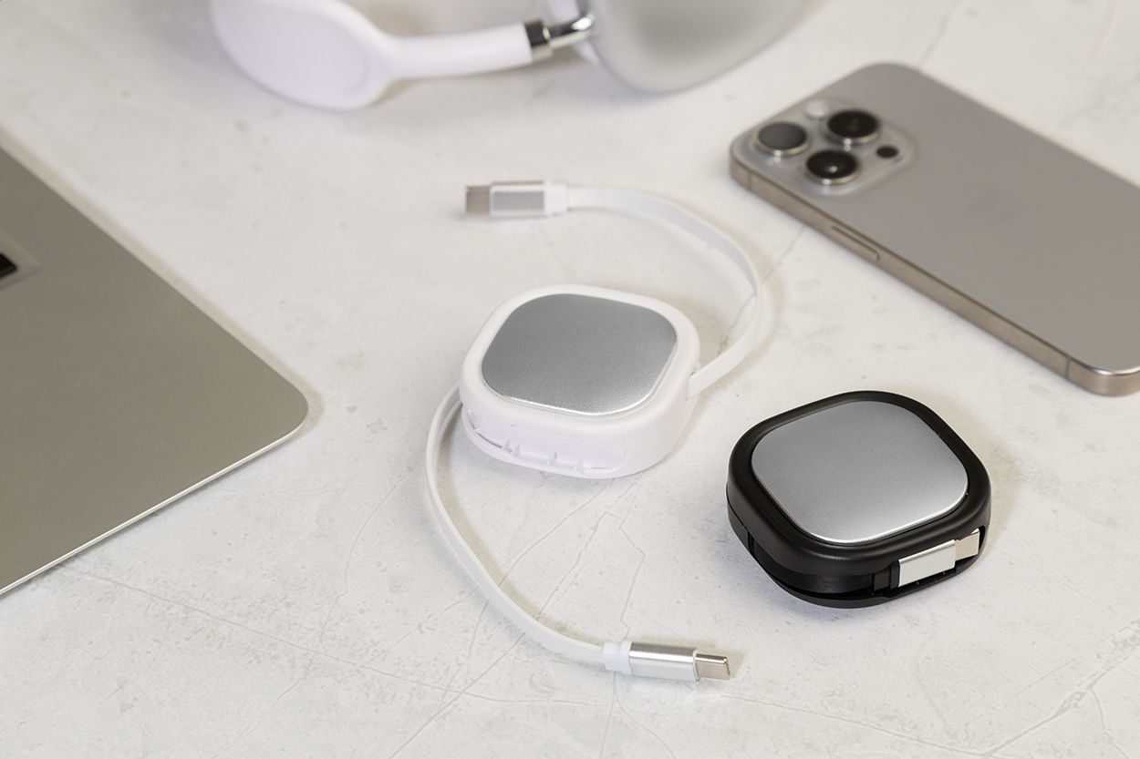Telescopic USB-C to USB-C charger cable in recycled ABS and recycled aluminium. Supporting 60W PD fast charging.