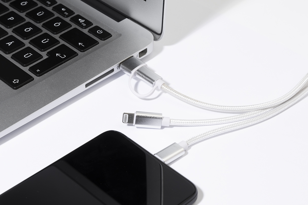 Recycled aluminium and RPET USB charger cable with keyring. With micro USB, USB-C and Lightning connectors. With USB and USB-C inputs.