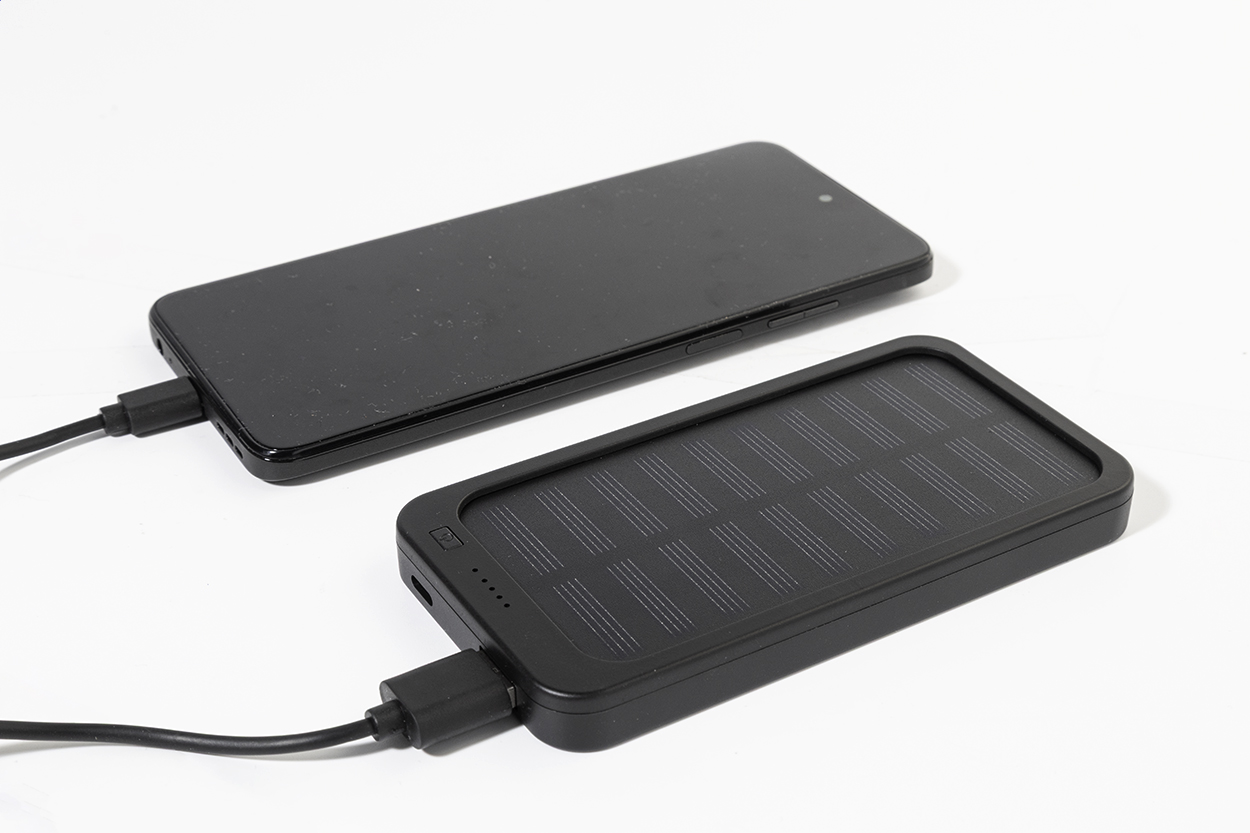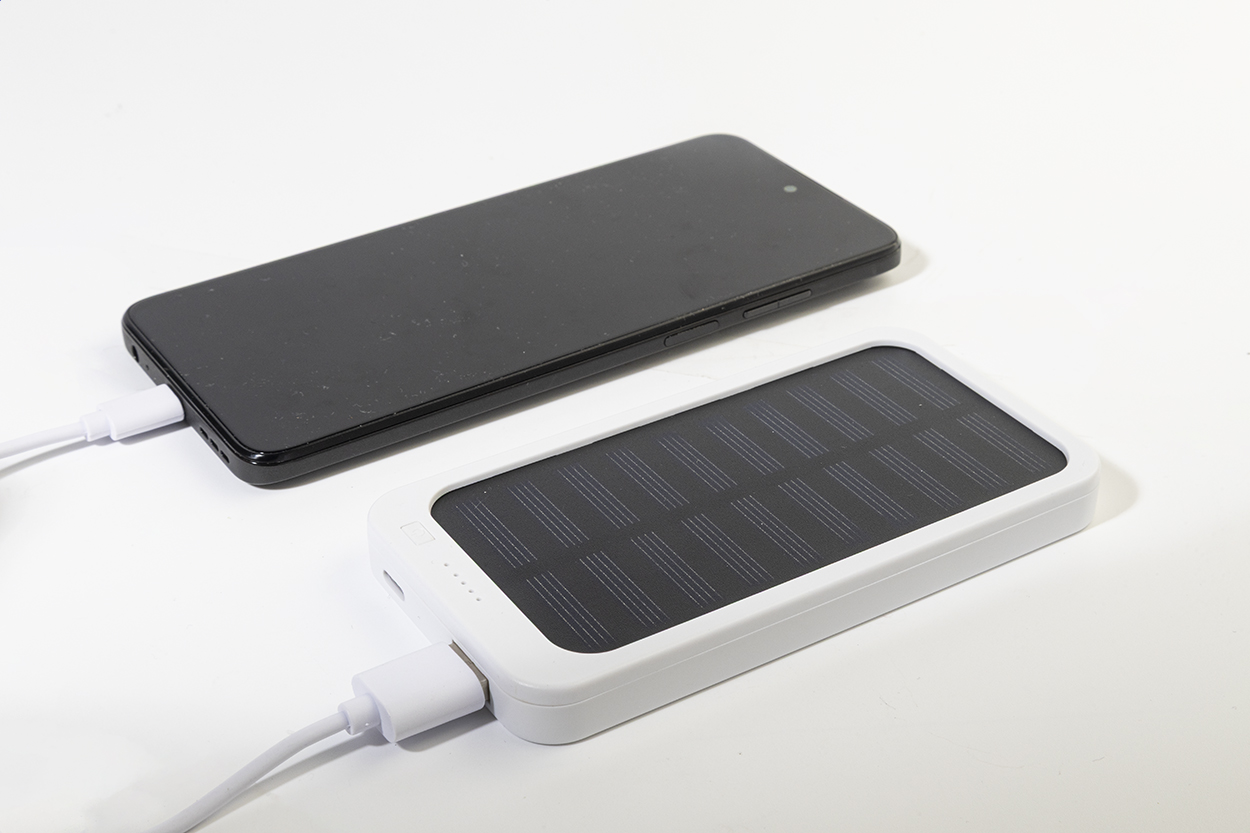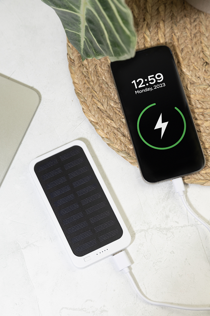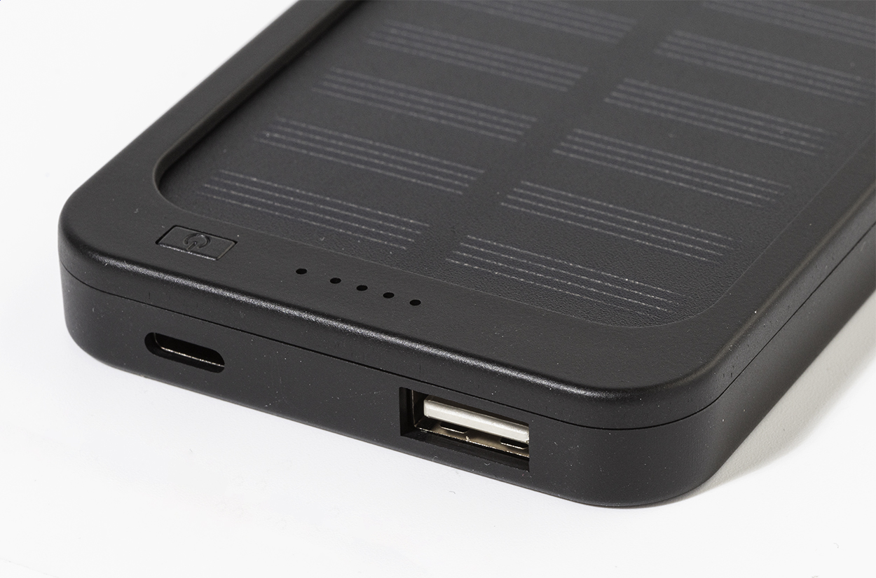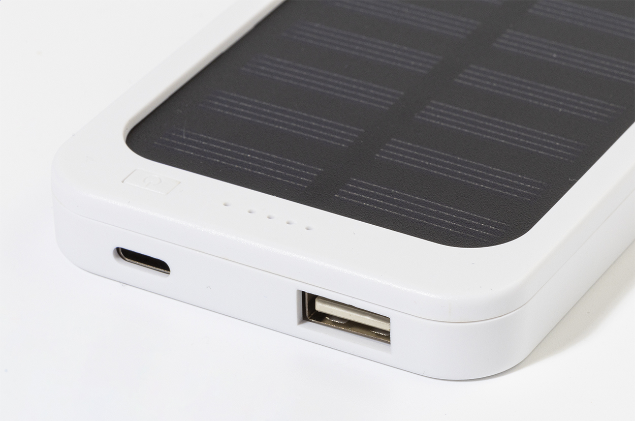 Recycled ABS power bank with built-in solar charger and 4000 mAh battery. With 1 USB and 1 USB-C charger ports. USB-C input port. Including USB charger cable.